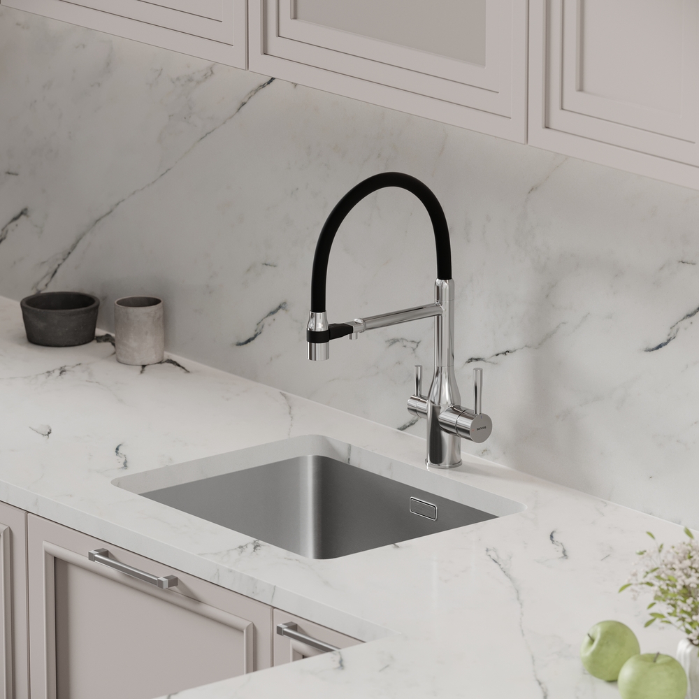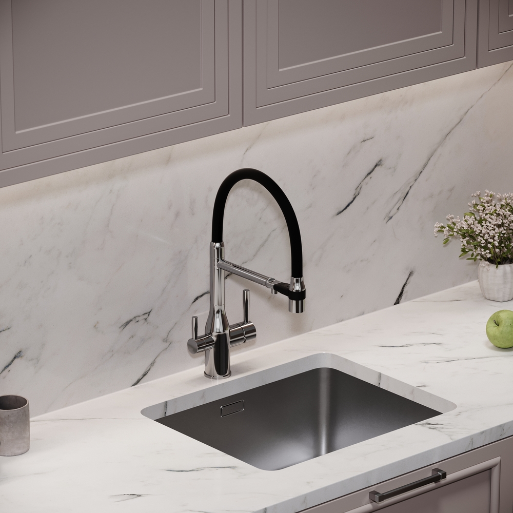 - Излив для фильтрованной воды интегрирован в держатель основного излива