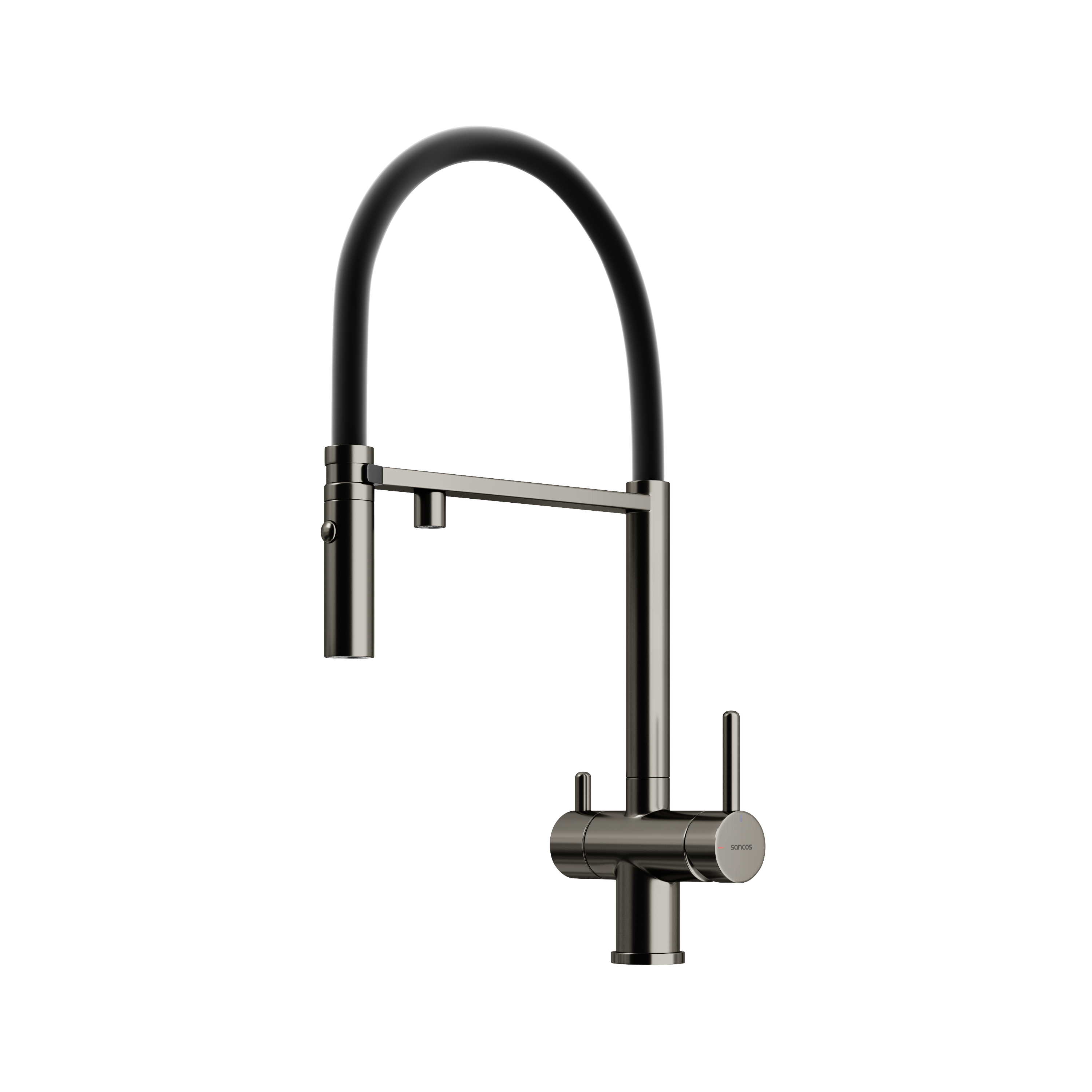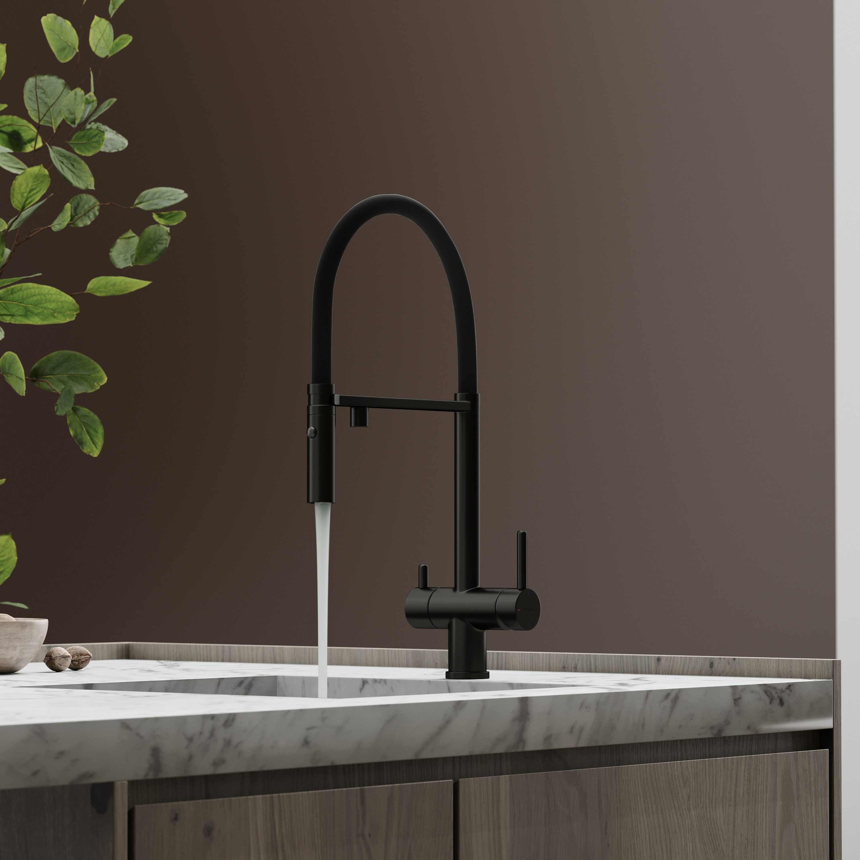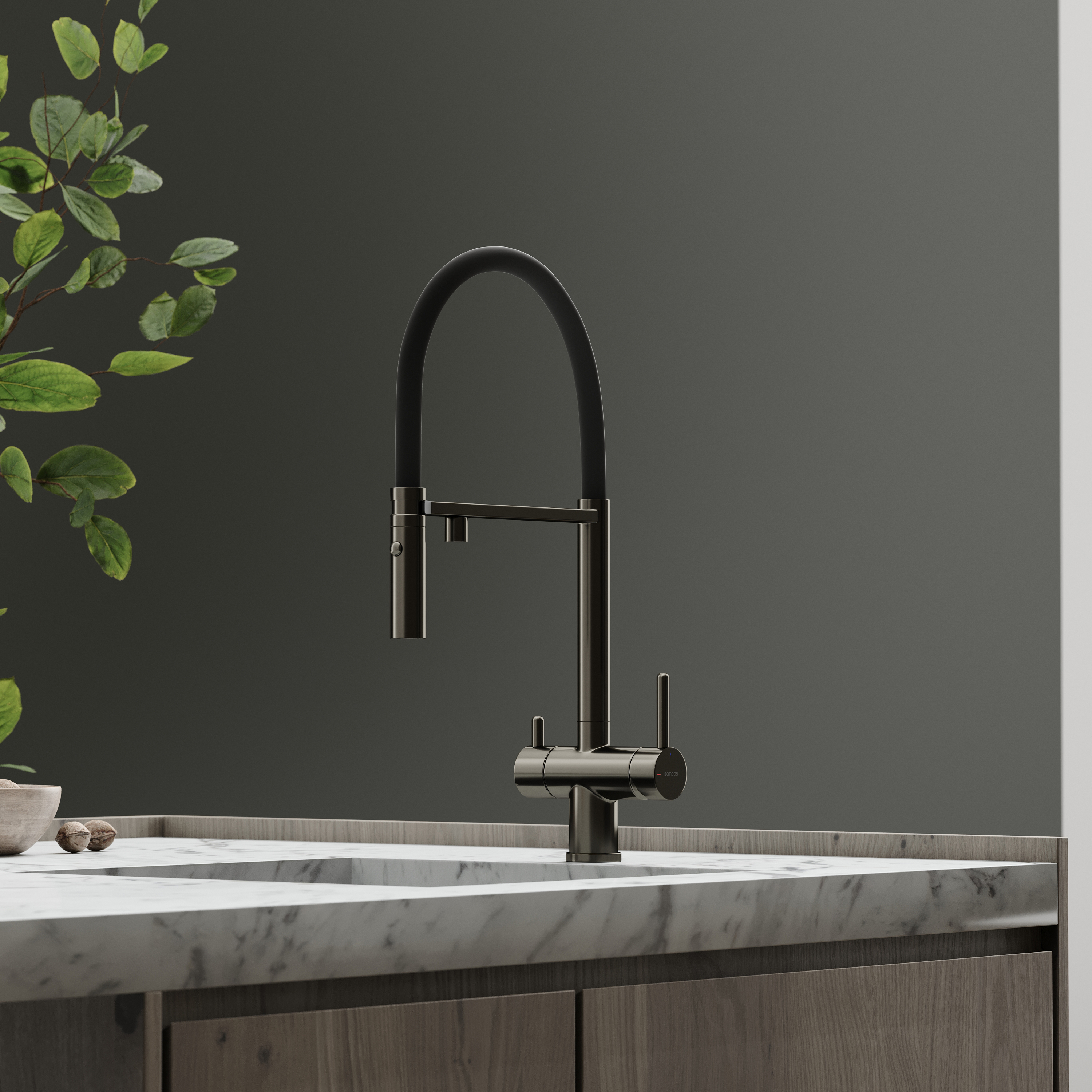 - Излив для фильтрованной воды интегрирован в держатель основного излива