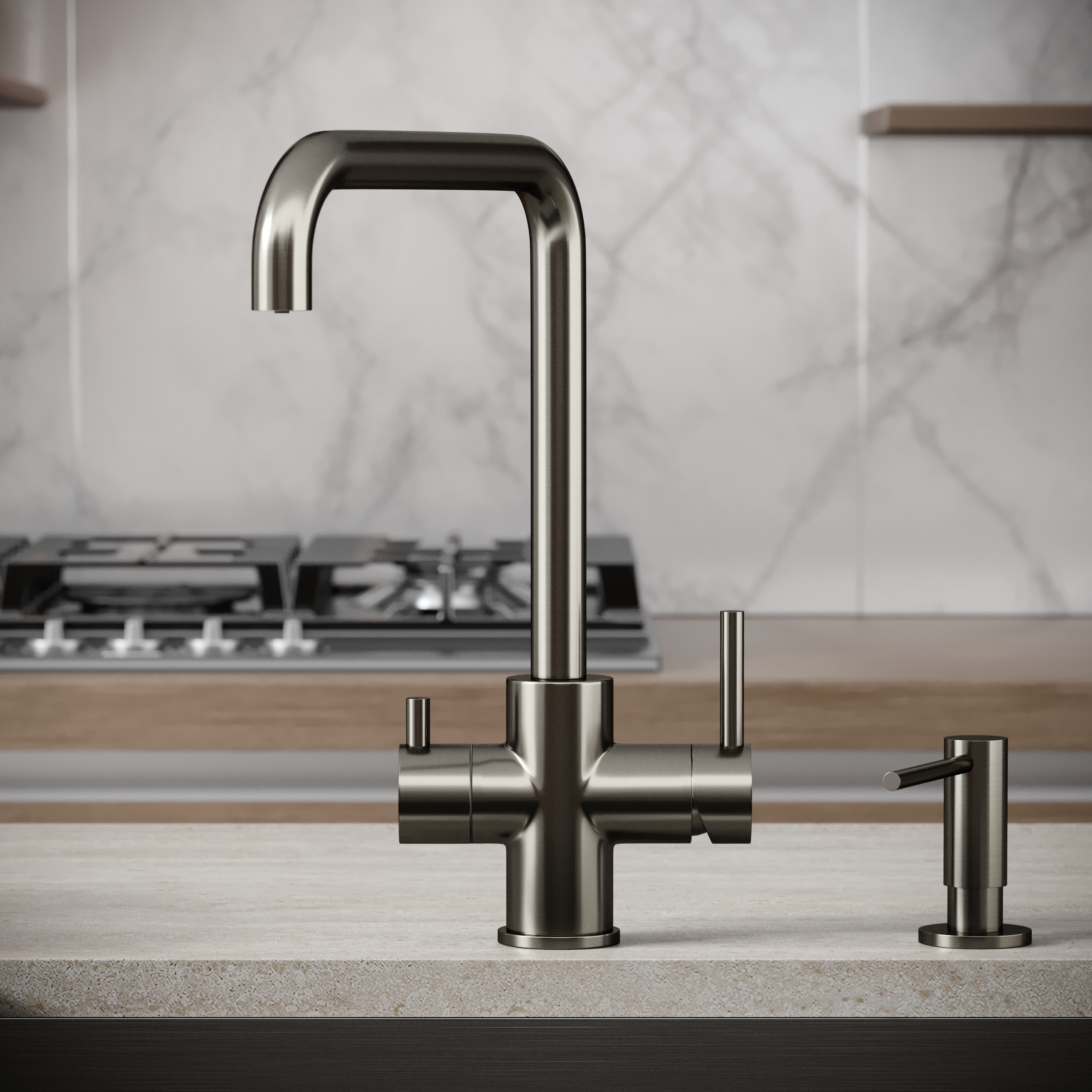 В комплекте: смеситель, комплект для подключения к фильтру, подводка для воды, монтажный комплект