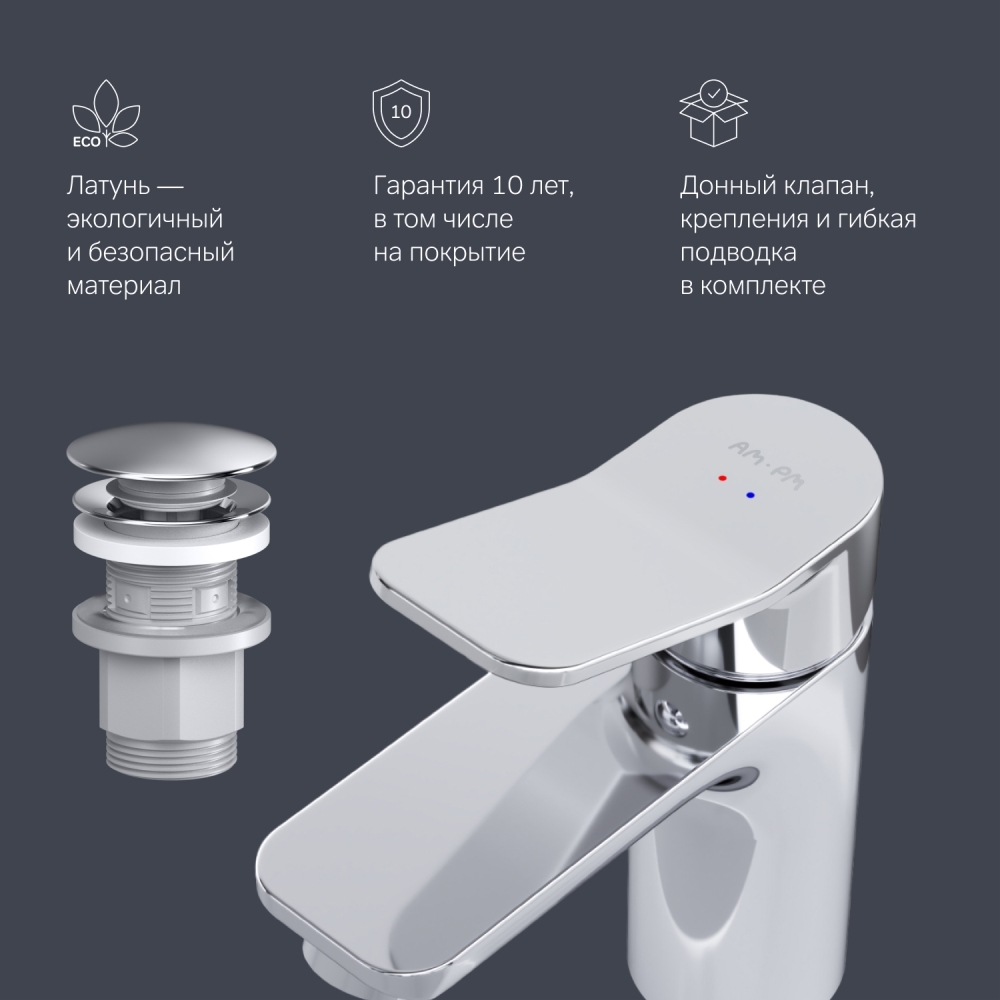 Смесители X-Joy – по-настоящему дизайнерские продукты в своем ценовом сегменте. Разработанные дизайн-агентством GP designpartners из Австрии в 2019 году смесители были удостоены престижной премии Red Dot Design Awards знака качества известного всему миру. Идеальная геометрия разработанная по стандарту SA (Smart Angle) – математически выверенное соотношение высоты смесителя длины излива и наклона корпуса для удобного использования на раковине размером от 50 до 120 см. Смеситель X-Joy оборудован специально спроектированным для AM.PM керамическим картриджем SoftMotion 35 мм который обеспечивает оптимальную регулировку температуры а также позволяет выдерживать любые перепады давления. Корпус смесителя X-Joy изготовлен по принципу цельного литья из латуни. Покрытие Everlast – вдвое превышает отраслевые стандарты по прочности и износостойкости. Ювелирный блеск и прочность покрытия достигаются по стандарту Chrome plating standard NSS 80H. Отдельная гарантия на корпус и покрытие – 10 лет в два раза больше чем принято по европейским стандартам. ""
