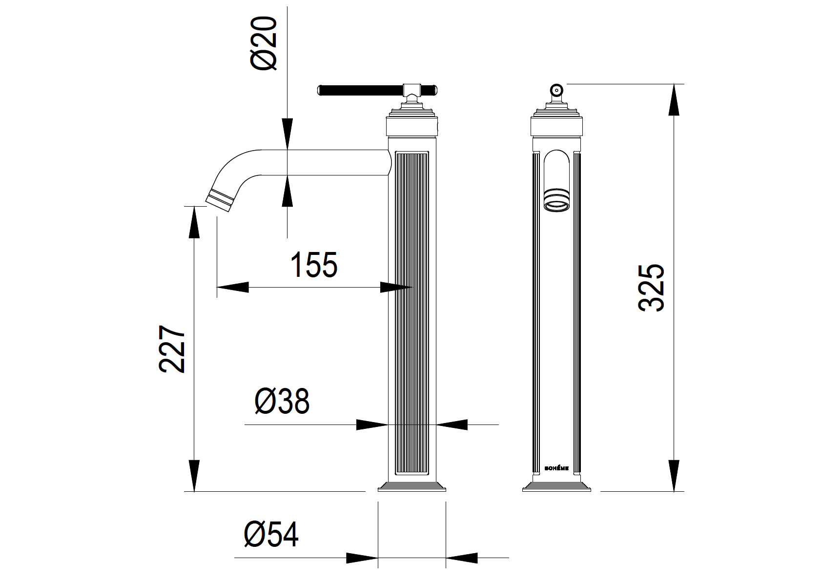 - Высота излива (расстояние от основания до крана): 22,7 см