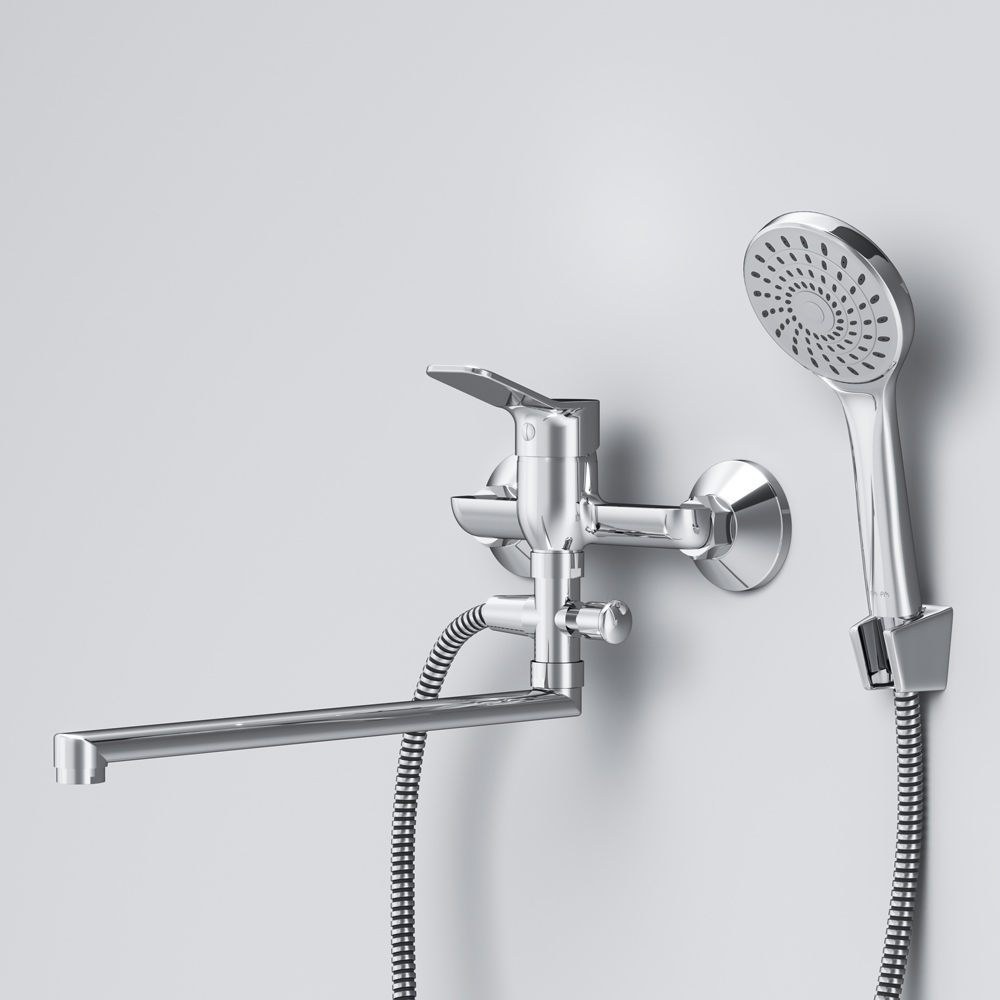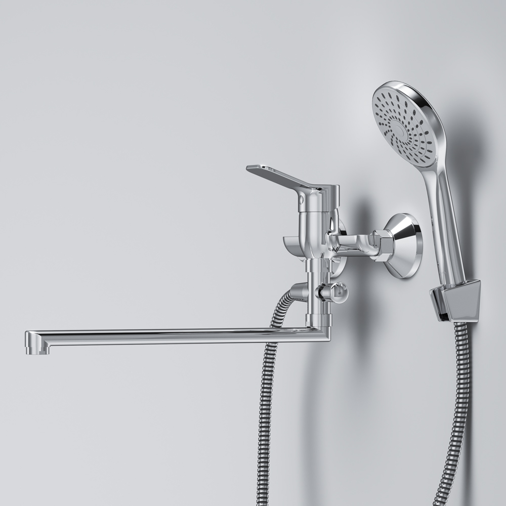 Стильное универсальное решение для ванной комнаты - качественный смеситель для ванны и душа с длинным поворотным изливом с душевым набором. Универсальный длинный излив позволяет использовать смеситель как для ванны так и для рядом стоящей раковины. Функциональный держатель для ручного душа на два положения добавит удобства использования. Душевой шланг длиной 150 см позволит наслаждаться душем даже высокому человеку. Максимум функций за разумную плату в одном изделии! Ультрамодный дизайн ручки придает смесителю дополнительную динамику и дарит непревзойденную легкость управления. Вы почувствуете это с первого прикосновения. Точная инженерия для Вашего комфорта: благодаря обширной зоне движения ручки управлять температурой воды стало еще проще. ""