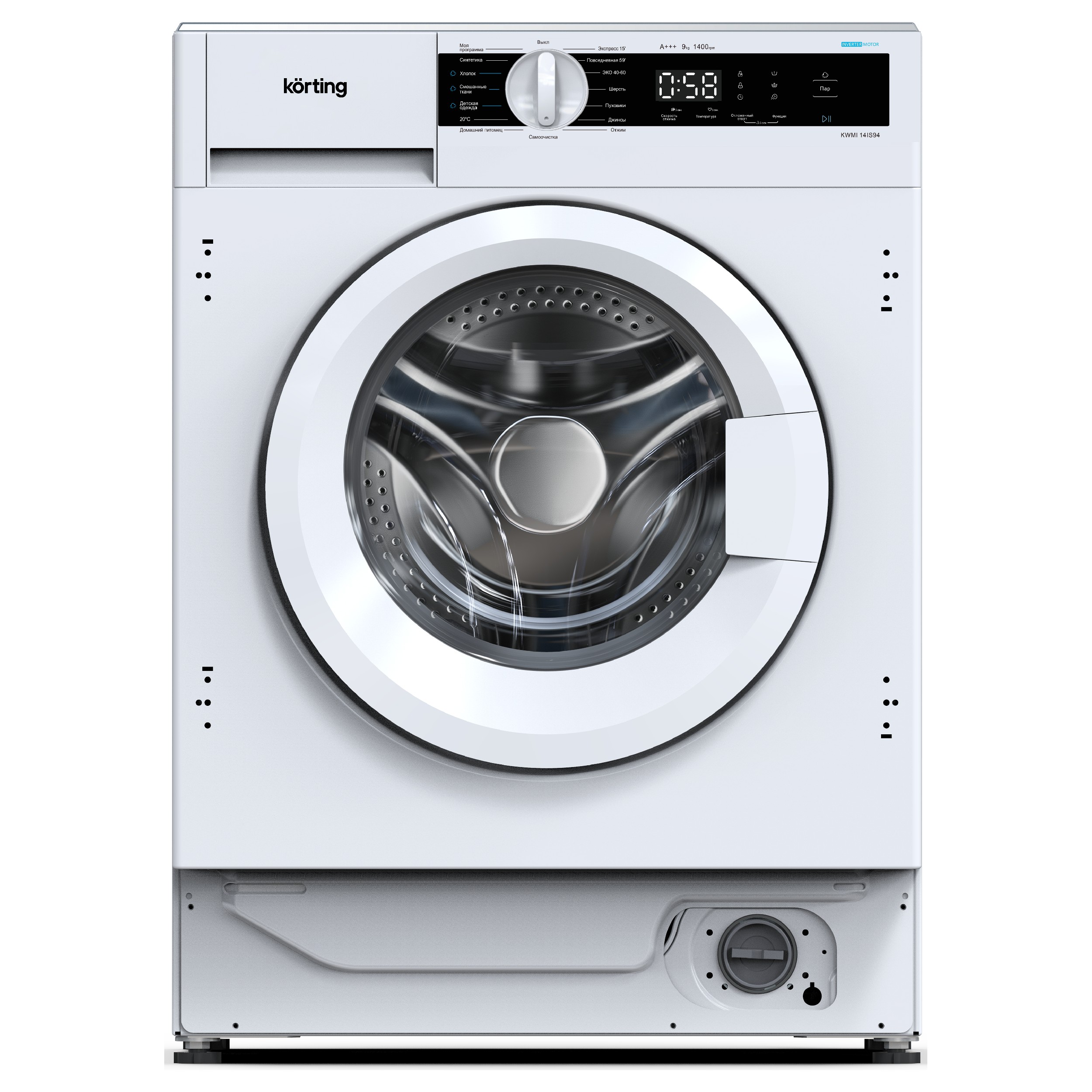 Инверторный мотор Инверторный мотор работает при помощи инверторного преобразователя и не имеет угольных щеток, благодаря чему надежность такого двигателя выше, так как он имеет меньше трущихся деталей. Снижается уровень шума и уровень потребление электроэнергии становится ниже. Функция Пара Стиральная машина с функцией пара набирает воду по окончанию основной программы и нагревает ее до температуры 80 градусов. Образовавшийся пар поступает в барабан, где происходит обработка тканей. Пар может быть добавлен в конце любого режима стирки, включая короткие программы и это дополнительная гигиена, дезинфекция и освежение вещей. Белье становится более воздушным и меньше сминается благодаря парообработке, соответственно его легче гладить. Функция «Защита детей» Чтобы любимое чадо не вмешивалось в процесс работы программы, есть возможность блокировки управления. При этой функции недоступны для нажатия любые кнопки кроме выключения машины. Функция «Отложенный старт» В некоторых случаях необходимо отложить включение прибора на несколько часов, чтобы, например, сэкономить на тарифах электроэнергии или завершить процесс к определенному времени. Отложенный старт позволяет запрограммировать прибор на автоматическое включение в нужное время. Функция Турбо+ Если одежда имеет слабые загрязнения, то рекомендуется выбирать функцию Турбо+. При этом сократится время выполнения выбранной программы, а также уменьшится расход воды и электроэнергии. Контроль пенообразования В случае излишнего пенообразования в баке, например, из-за неправильно выбранного типа или количества моющего средства, а также при стирке тканей с большим количеством микроотверстий, стиральная машина самостоятельно настроит длительность и количество полосканий для полного устранения пены и остатков моющего средства в ткани. Контроль баланса барабана В процессе отжима стиральная машина контролирует, насколько равномерно белье распределено по поверхности барабана и в случае возникновения дисбаланса самостоятельно устраняет его, используя особый алгоритм вращения. В особых случаях, когда дисбаланс не удалось устранить, стиральная машина отключит цикл отжима, тем самым предотвращая сильный шум и вибрации. Режим «Моя программа» Вы можете создать свою программу стирки с необходимой температурой, скоростью оборотов при отжиме, и дополнительными функциями. Сохранённая Вами программа всегда будет под рукой на самом верхнем положении регулятора.