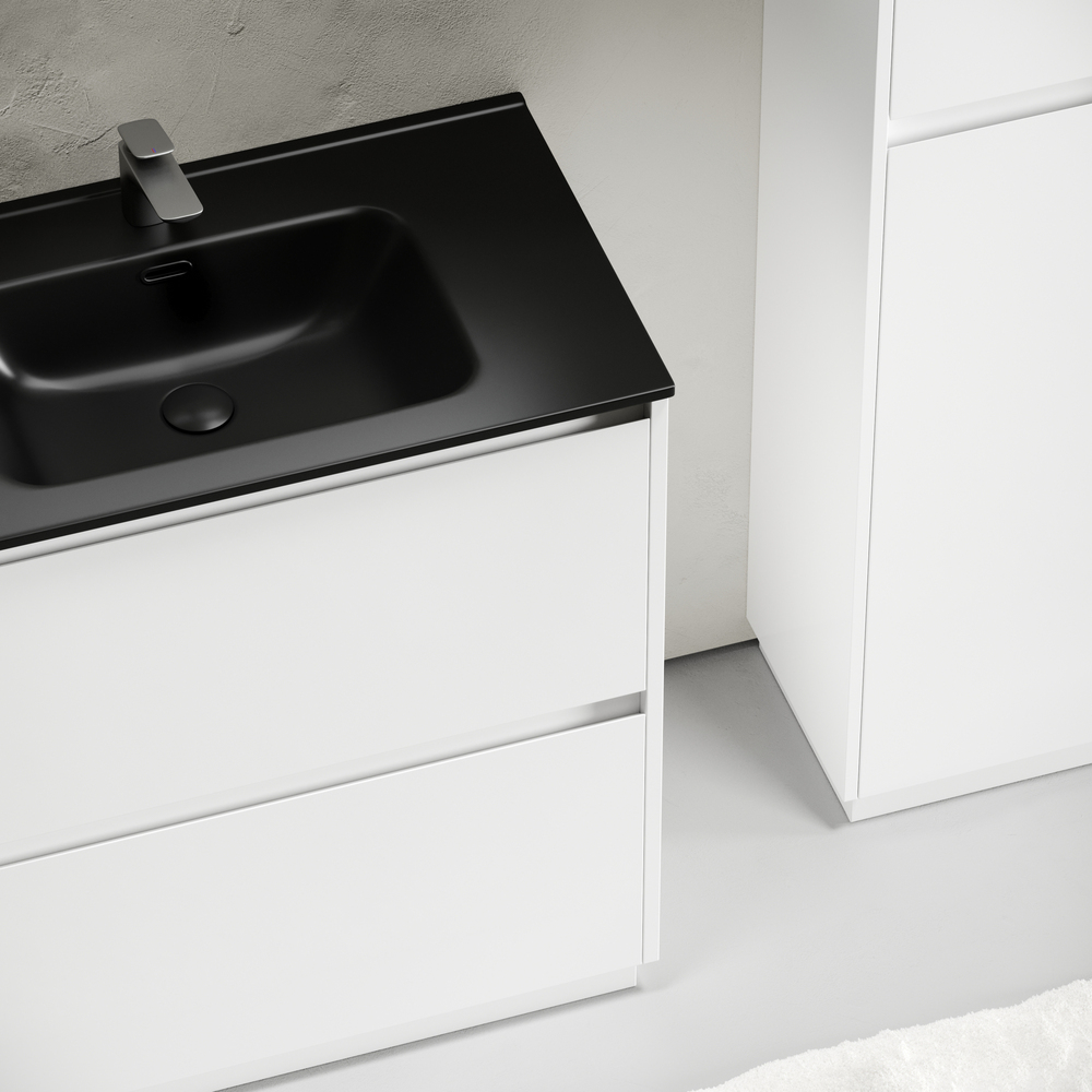 Тумба напольная Libra c двумя ящиками с доводчиками скрытого монтажа, с системой плавного закрывания и с ручкой по всей длине ящика. Каркас и фасад тумбы выполнен из МДФ, покрытие эмаль, цвет белый глянец. Основание тумбы имеет ножки c регулировкой высоты до10 мм для компенсации возможной неровности напольного покрытия. Внутреннее пространство тумбы выполнено из надежного ЛДСП серого цвета. Размер 790х450х840, артикул LB80FW.