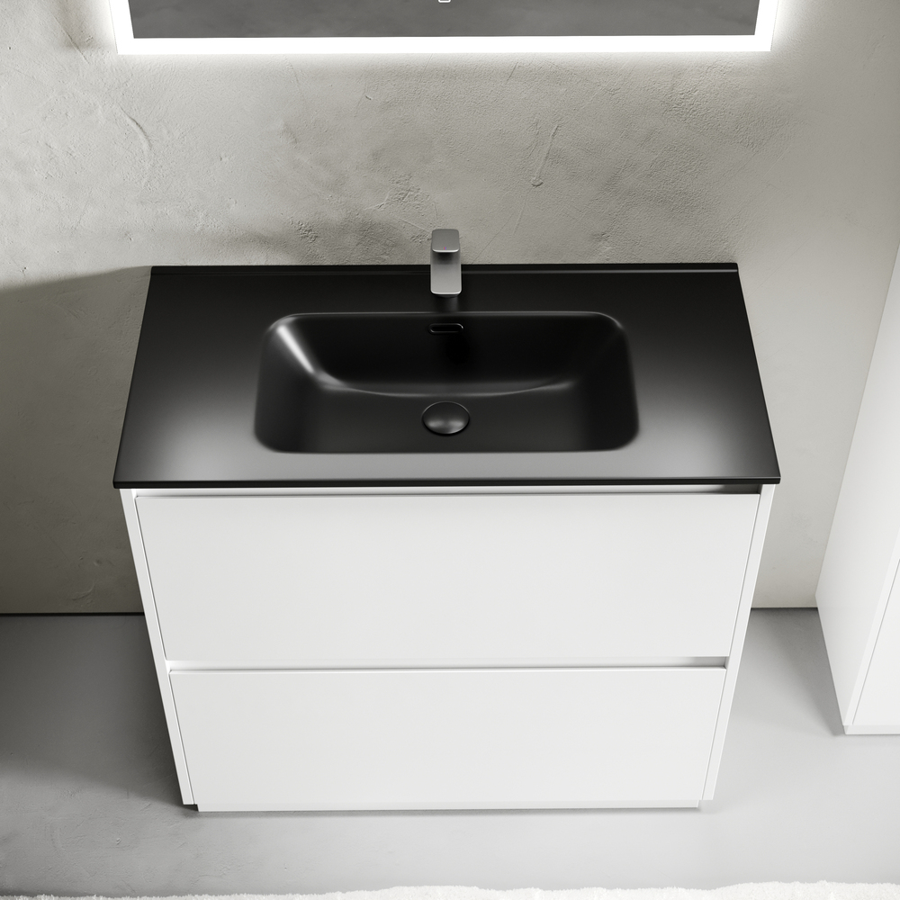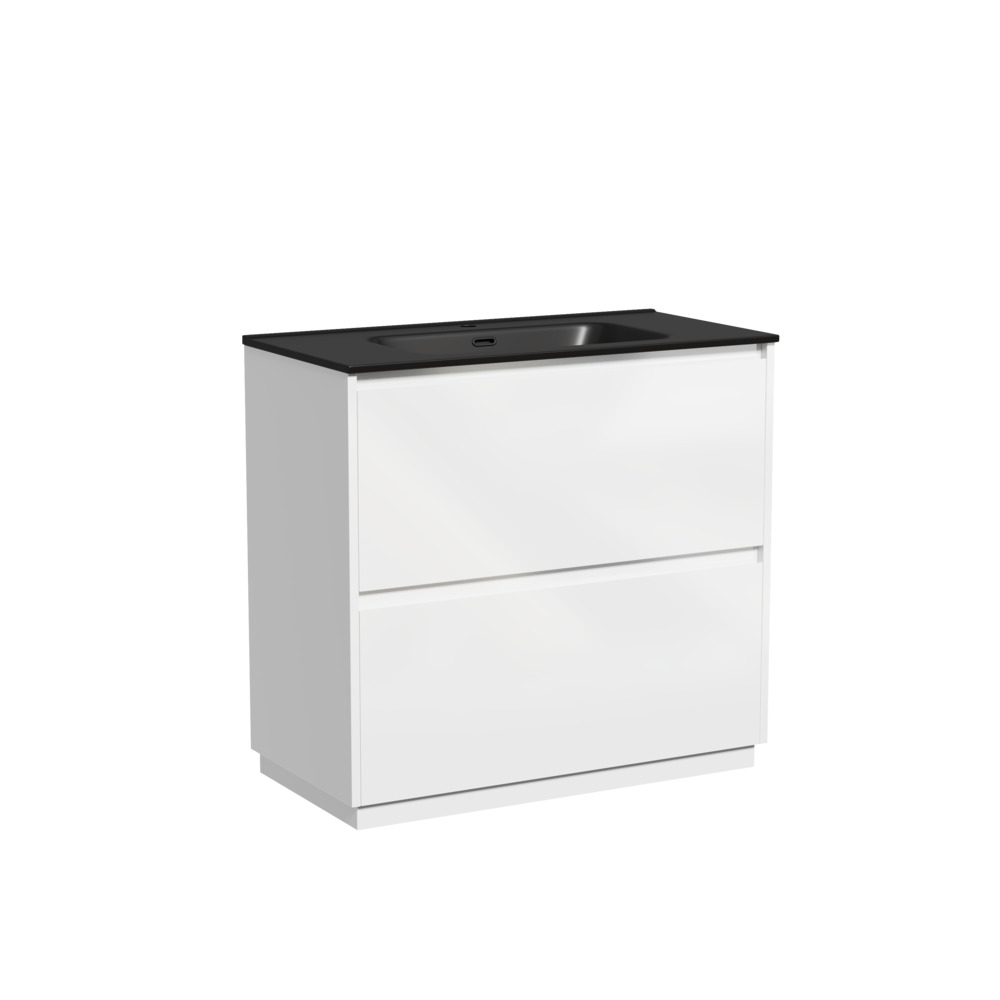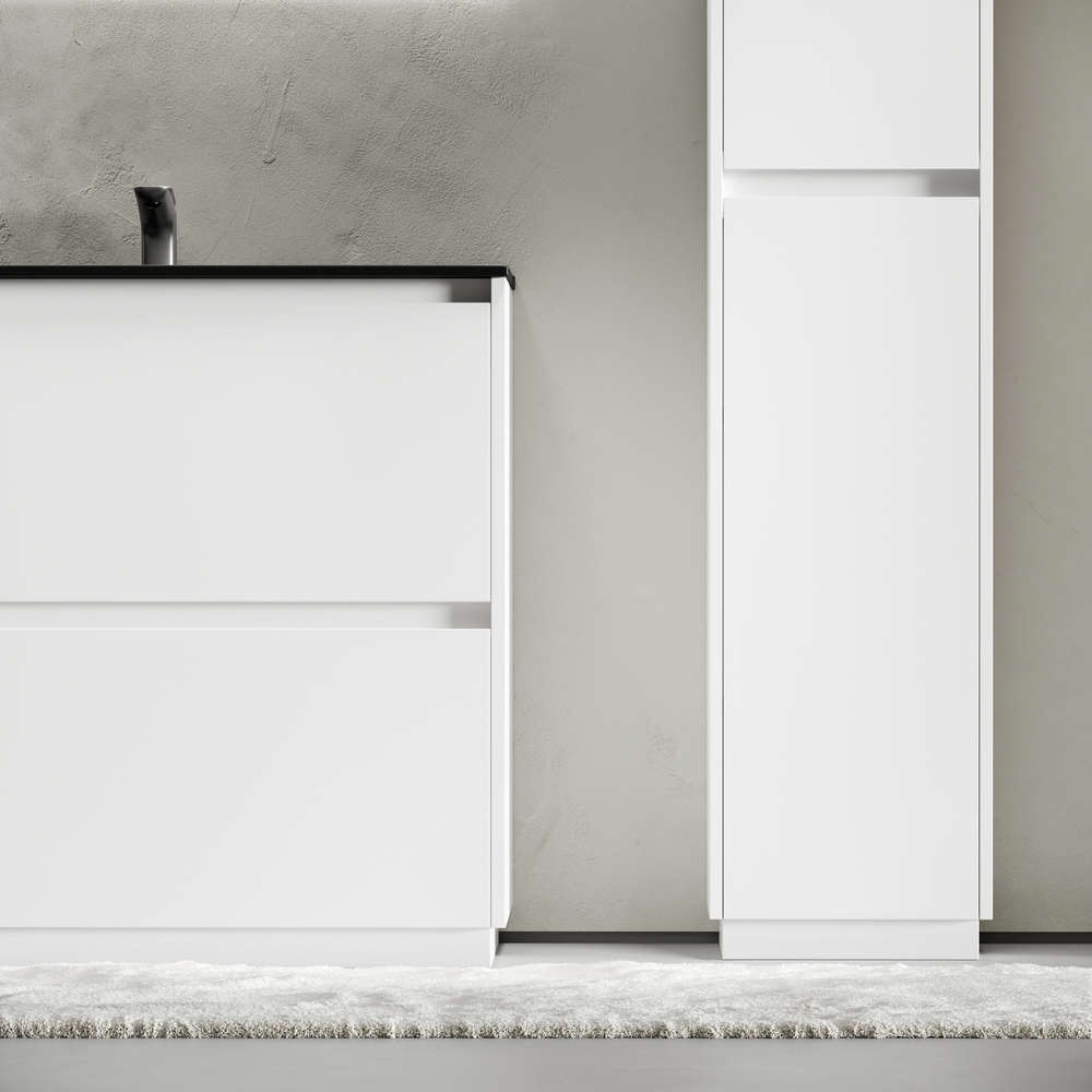 Тумба напольная Libra c двумя ящиками с доводчиками скрытого монтажа, с системой плавного закрывания и с ручкой по всей длине ящика. Каркас и фасад тумбы выполнен из МДФ, покрытие эмаль, цвет белый глянец. Основание тумбы имеет ножки c регулировкой высоты до10 мм для компенсации возможной неровности напольного покрытия. Внутреннее пространство тумбы выполнено из надежного ЛДСП серого цвета. Размер 890х450х840, артикул LB90FW.