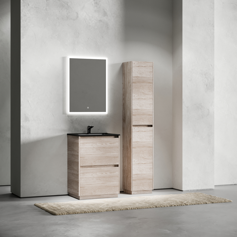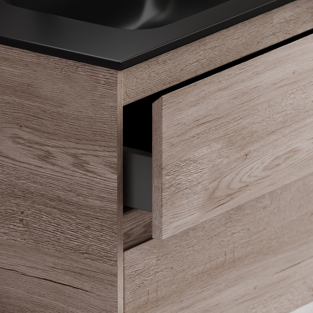 Тумба напольная Libra c двумя ящиками с доводчиками скрытого монтажа, с системой плавного закрывания и с ручкой по всей длине ящика. Каркас и фасад тумбы выполнен из ЛДСП в цвете «дуб галифакс натуральный». Покрытие - ламинат. Основание тумбы имеет ножки c регулировкой высоты до10 мм для компенсации возможной неровности напольного покрытия. Внутреннее пространство тумбы выполнено из надежного ЛДСП серого цвета. Размер 590х450х840, артикул LB60FEG.