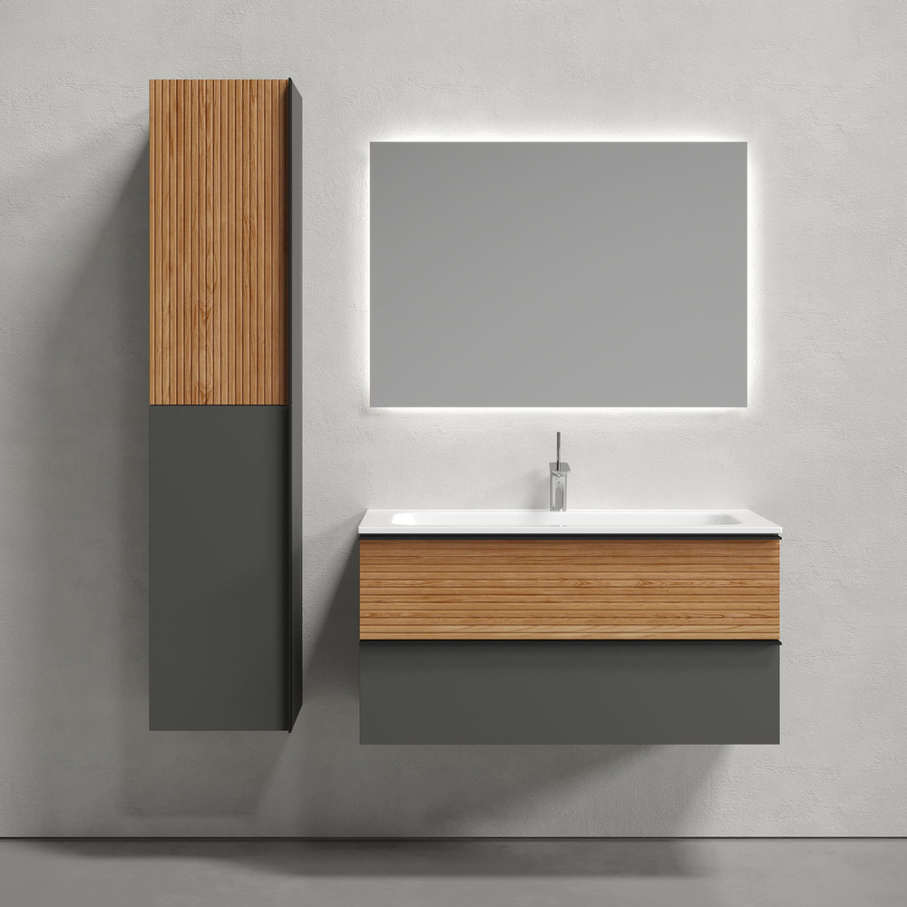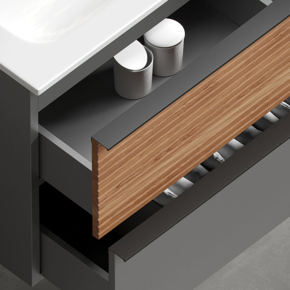 Тумба подвесная Delta c двумя ящиками оснащенными доводчиками скрытого монтажа с системой плавного закрывания и черными профильными накладными ручками. Каркас и фасад тумбы выполнен из мдф, покрытие пвх - пленка в цвете «дуб красный/графит».