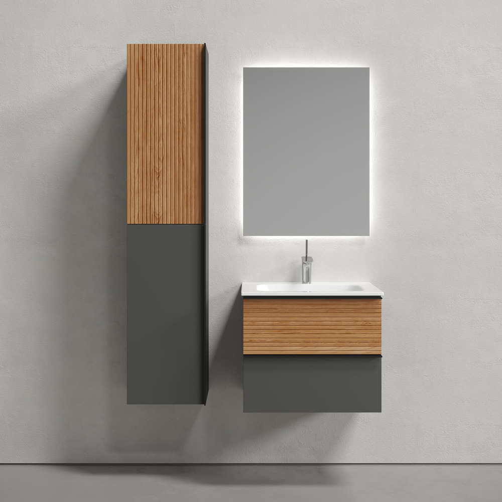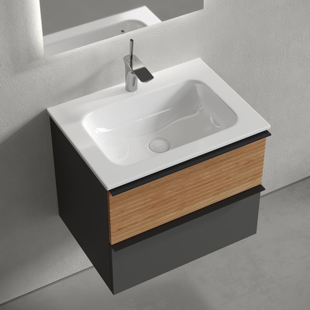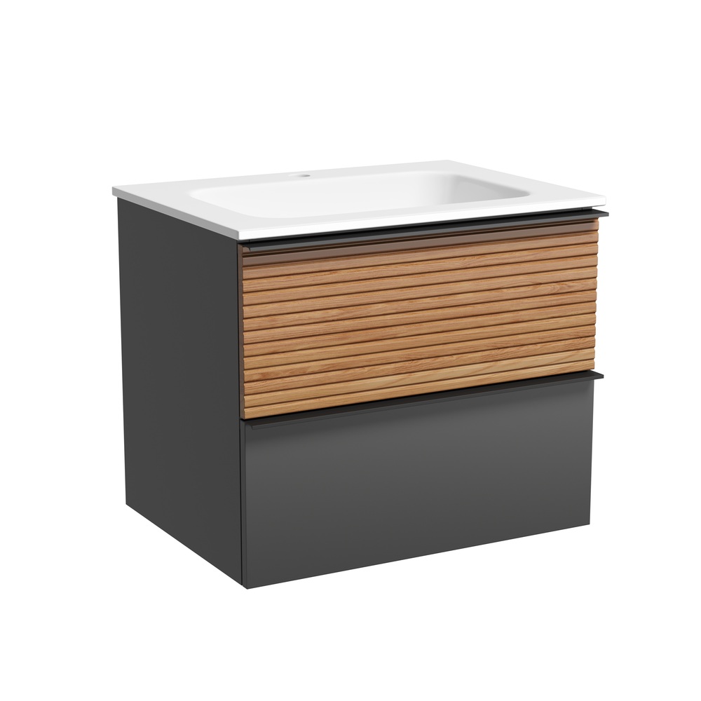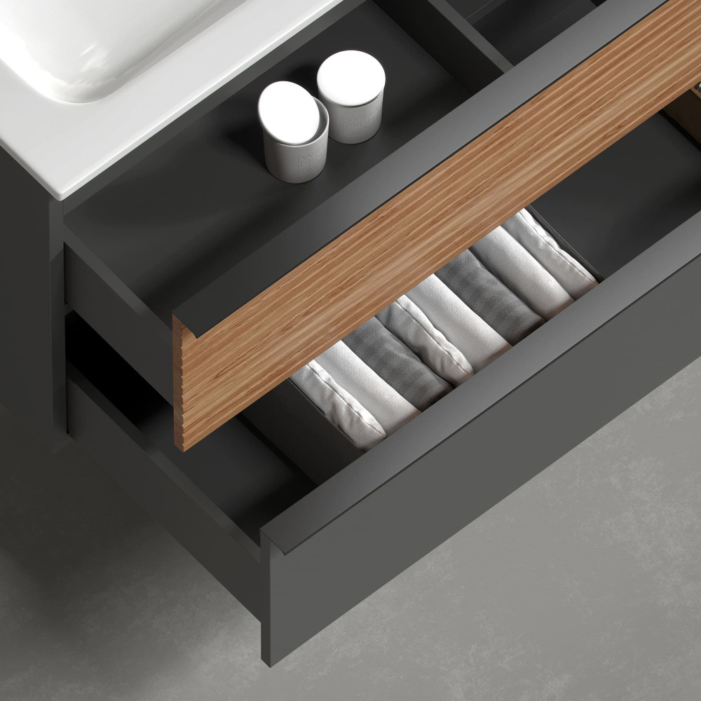 Тумба подвесная Delta c двумя ящиками оснащенными доводчиками скрытого монтажа с системой плавного закрывания и черными профильными накладными ручками. Каркас и фасад тумбы выполнен из МДФ, покрытие пвх - пленка в цвете «дуб красный/графит».