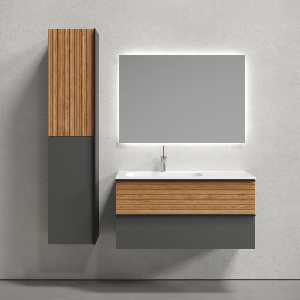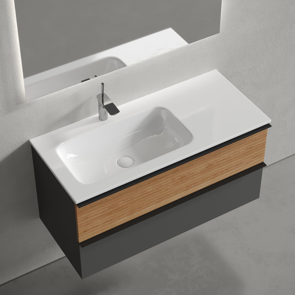Тумба подвесная Delta левая c двумя ящиками оснащенными доводчиками скрытого монтажа с системой плавного закрывания и черными профильными накладными ручками. Каркас и фасад тумбы выполнен из МДФ, покрытие пвх - пленка в цвете «дуб красный/графит».