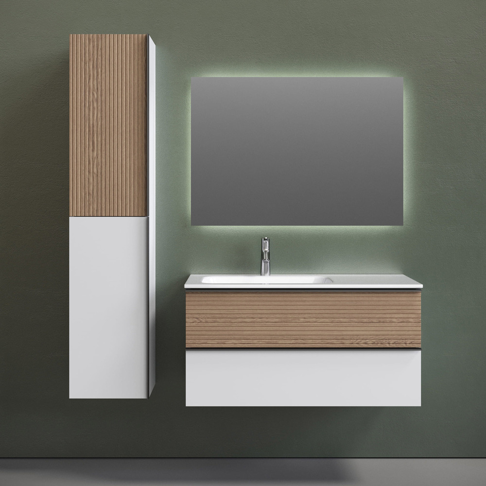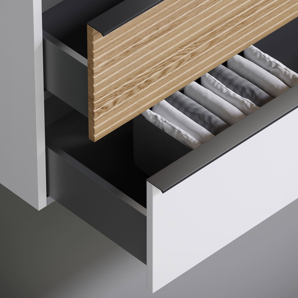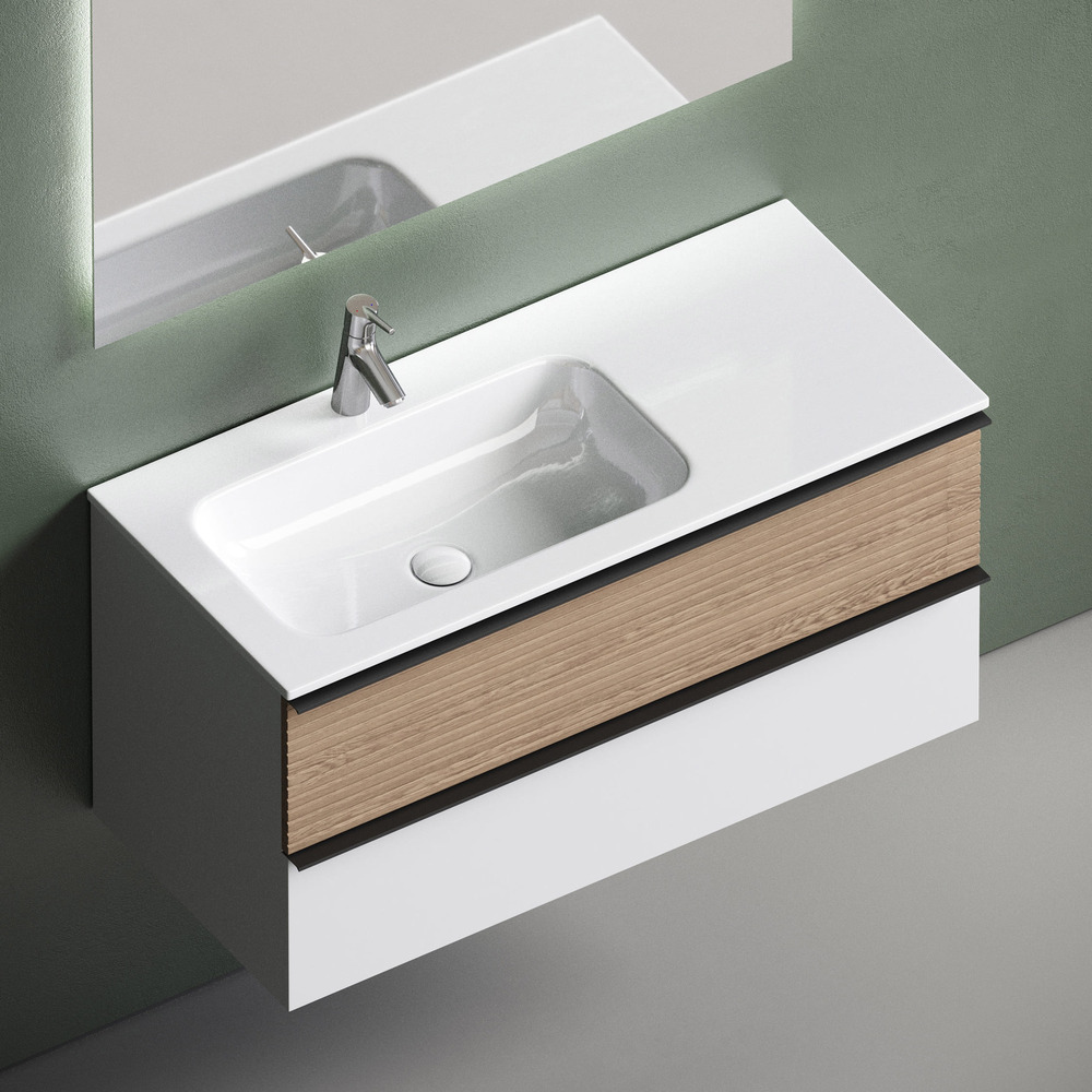 Тумба подвесная Delta левая c двумя ящиками оснащенными доводчиками скрытого монтажа с системой плавного закрывания и черными профильными накладными ручками. Каркас и фасад тумбы выполнен из МДФ, покрытие пвх - пленка в цвете «дуб светлый/белый».