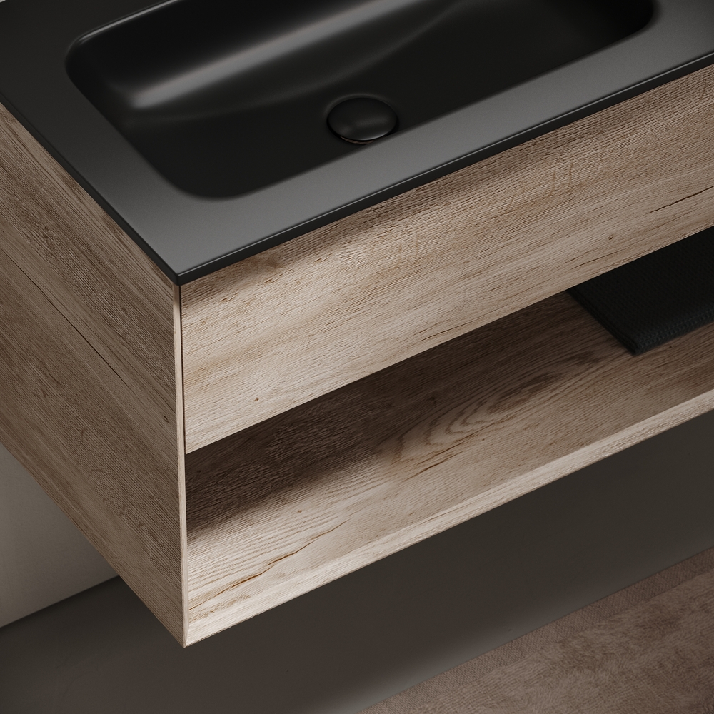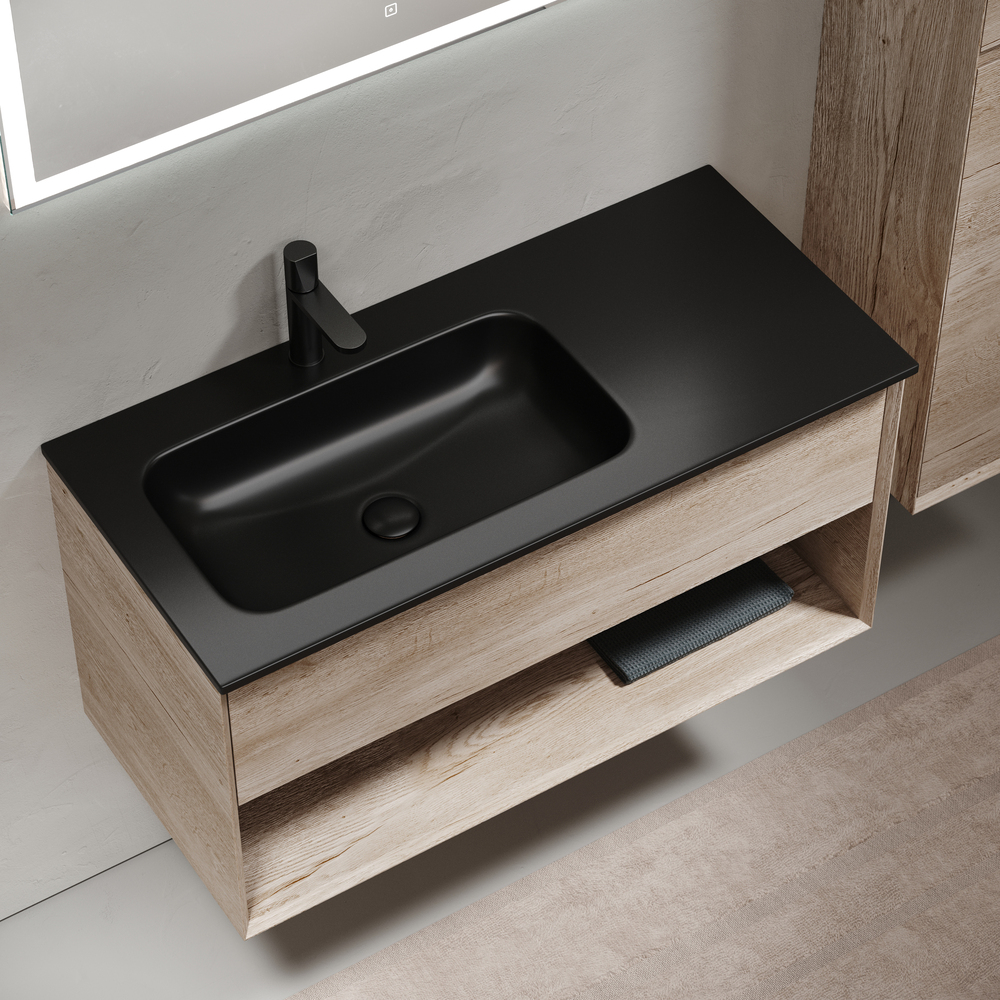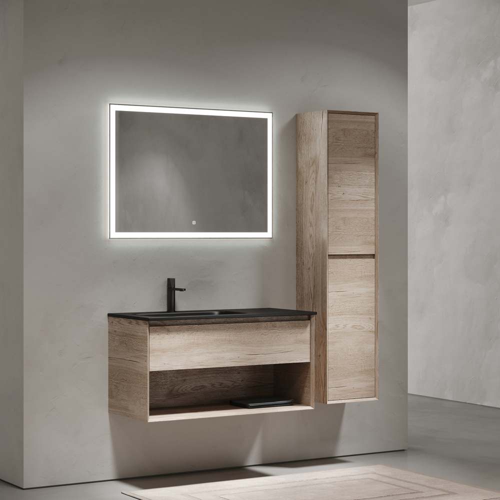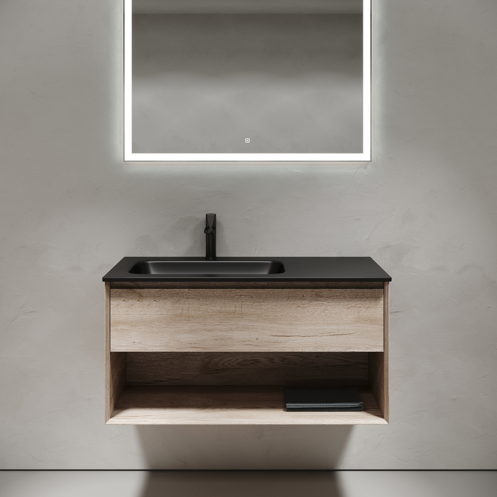 Тумба подвесная SANCOS Marmi 1.0 левая, 995х445х520, c одним ящиком оснащенным доводчиками скрытого монтажа с системой Soft close (плавного закрывания) и открытой нишей, c фрезерованной ручкой по всей длине фасада, дуб галифакс натуральный, арт. MR1.0100LEG