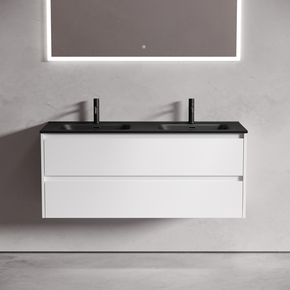 Тумба подвесная Libra c двумя ящиками оснащенными доводчиками скрытого монтажа с системой плавного закрывания и с ручкой по всей длине ящика. Каркас и фасад тумбы выполнен из мдф в цвете «белый глянец».