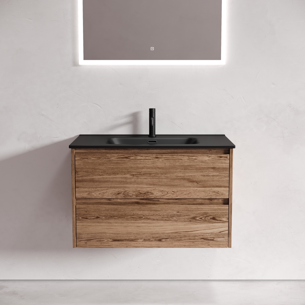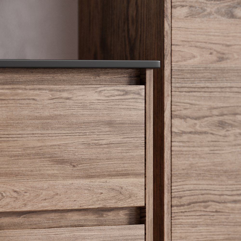 Тумба подвесная Libra c двумя ящиками оснащенными доводчиками скрытого монтажа с системой плавного закрывания и с ручкой по всей длине ящика. Каркас и фасад тумбы выполнен из ЛДСП в цвете «дуб чарльстон». Покрытие - ламинат.