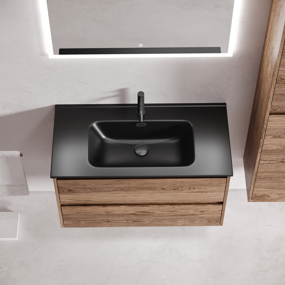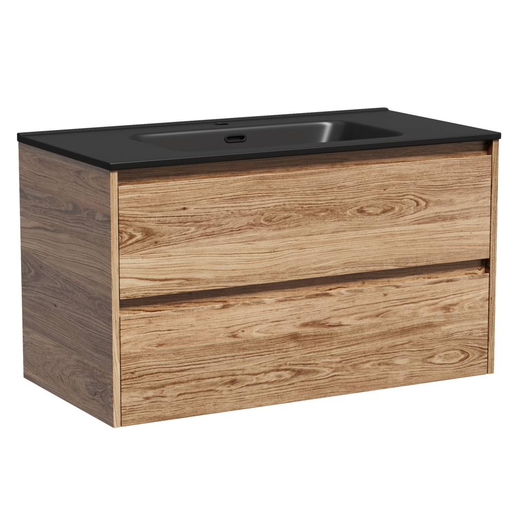 Тумба подвесная Libra c двумя ящиками оснащенными доводчиками скрытого монтажа с системой плавного закрывания и с ручкой по всей длине ящика. Каркас и фасад тумбы выполнен из ЛДСП в цвете «дуб чарльстон». Покрытие - ламинат.