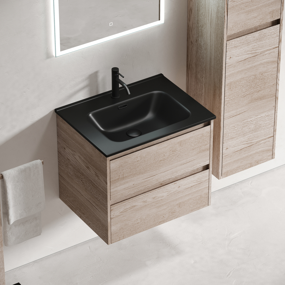 Тумба подвесная Libra c двумя ящиками оснащенными доводчиками скрытого монтажа с системой плавного закрывания и с ручкой по всей длине ящика. Каркас и фасад тумбы выполнен из ЛДСП в цвете «дуб галифакс натуральный». Покрытие - ламинат.