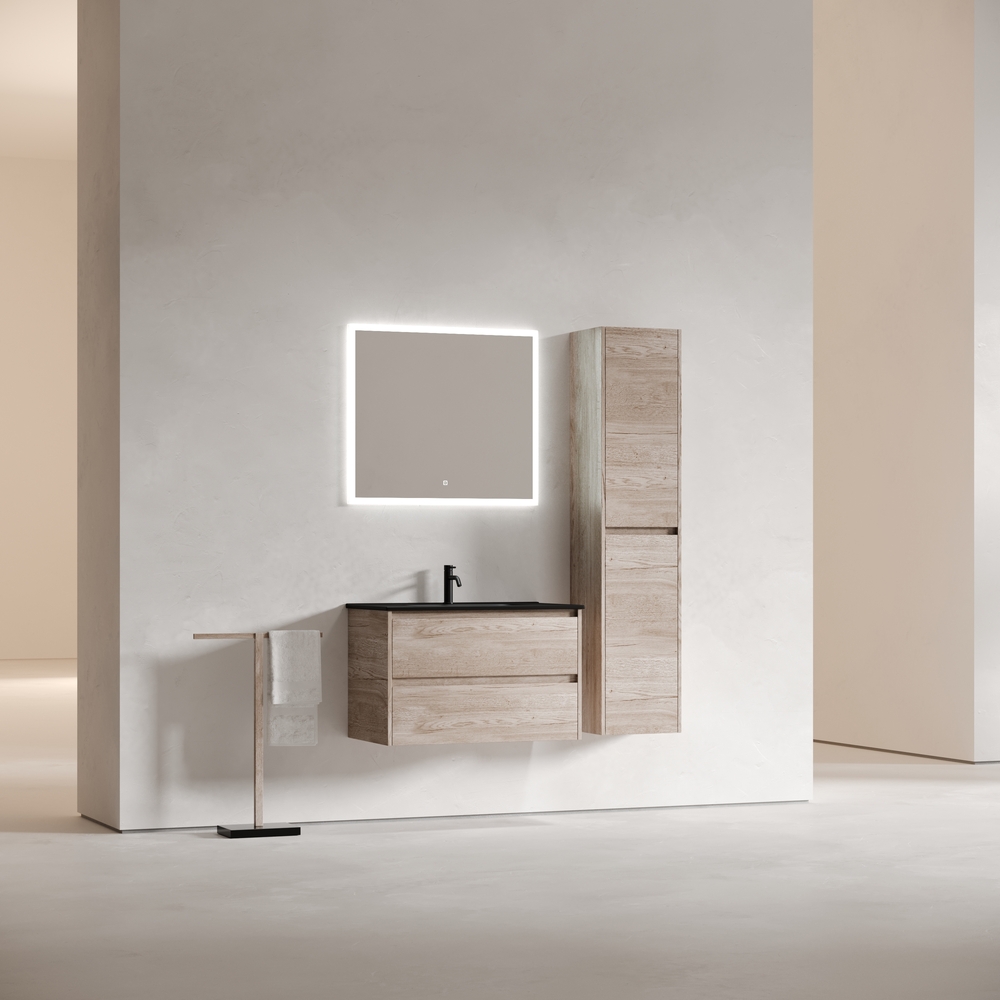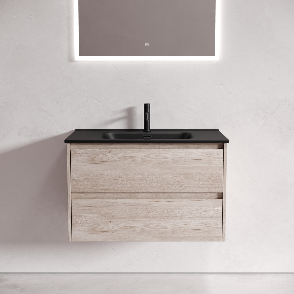 Тумба подвесная Libra c двумя ящиками оснащенными доводчиками скрытого монтажа с системой плавного закрывания и с ручкой по всей длине ящика. Каркас и фасад тумбы выполнен из ЛДСП в цвете «дуб галифакс натуральный». Покрытие - ламинат.