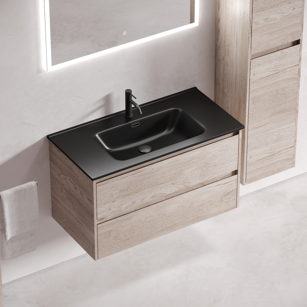 Тумба подвесная Libra c двумя ящиками оснащенными доводчиками скрытого монтажа с системой плавного закрывания и с ручкой по всей длине ящика. Каркас и фасад тумбы выполнен из ЛДСП в цвете «дуб галифакс натуральный». Покрытие - ламинат.