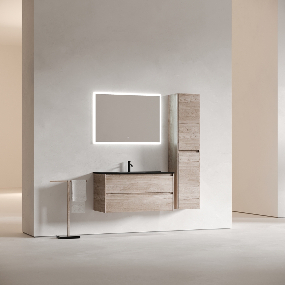 Тумба подвесная Libra c двумя ящиками оснащенными доводчиками скрытого монтажа с системой плавного закрывания и с ручкой по всей длине ящика. Каркас и фасад тумбы выполнен из ЛДСП в цвете «дуб галифакс натуральный». Покрытие - ламинат.