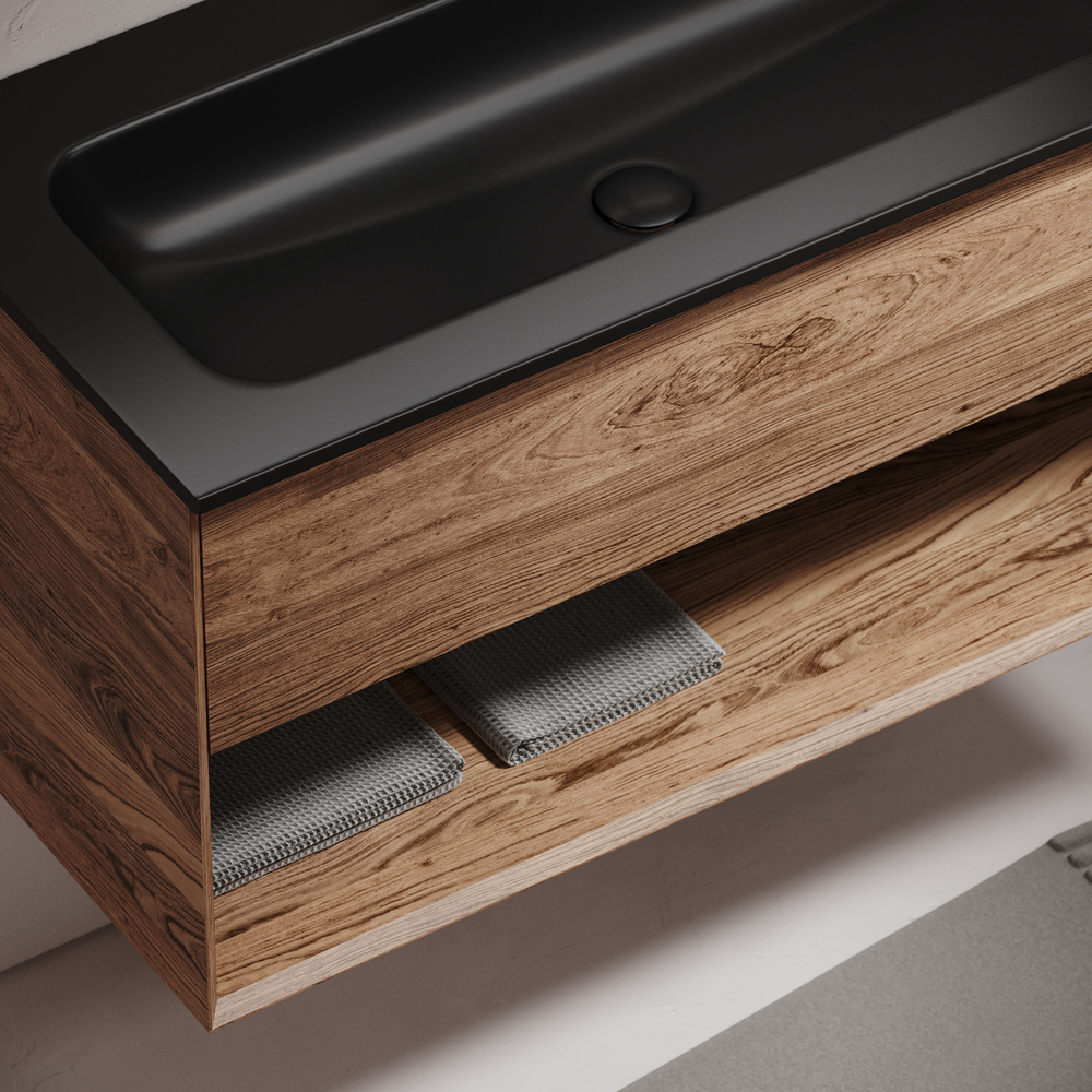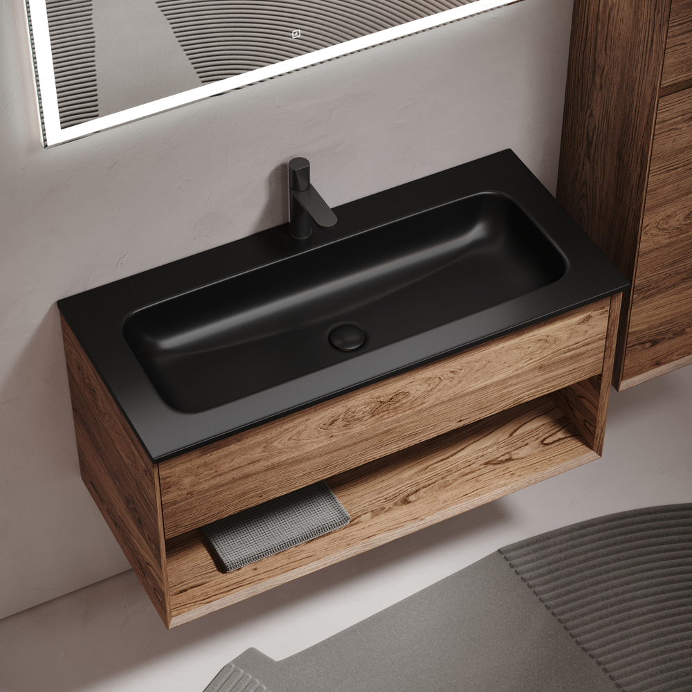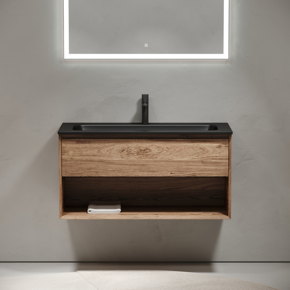 Тумба подвесная SANCOS Marmi 1.0 995х445х520 c одним ящиком оснащенным доводчиками скрытого монтажа с системой Soft close (плавного закрывания) и открытой нишей, c фрезерованной ручкой по всей длине фасада, дуб чарльстон, арт.MR1.0100ECH