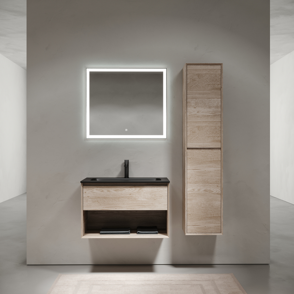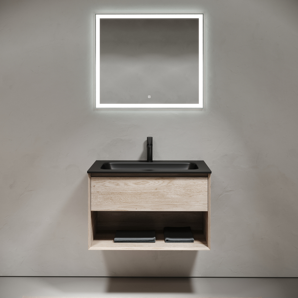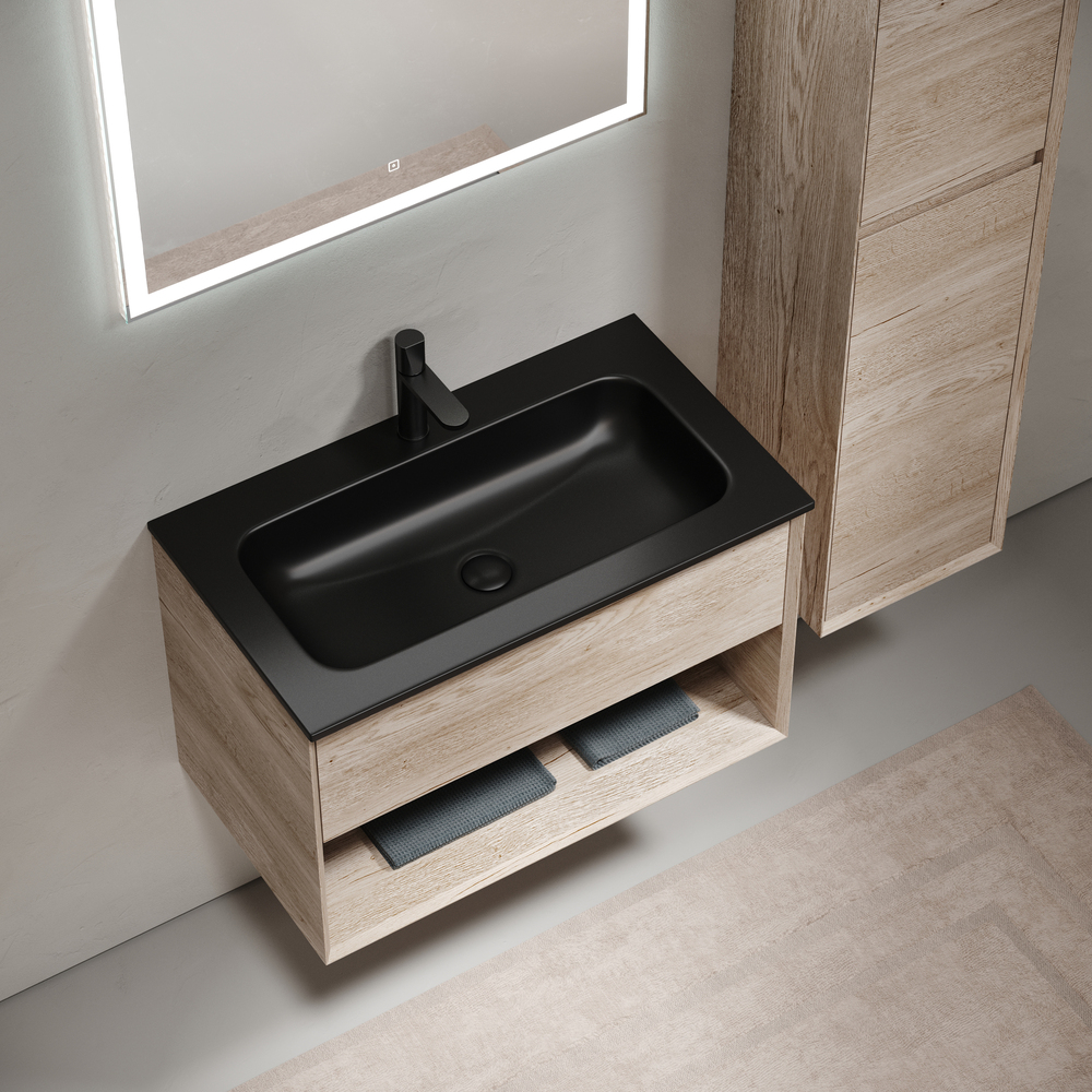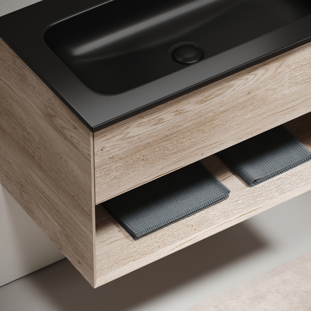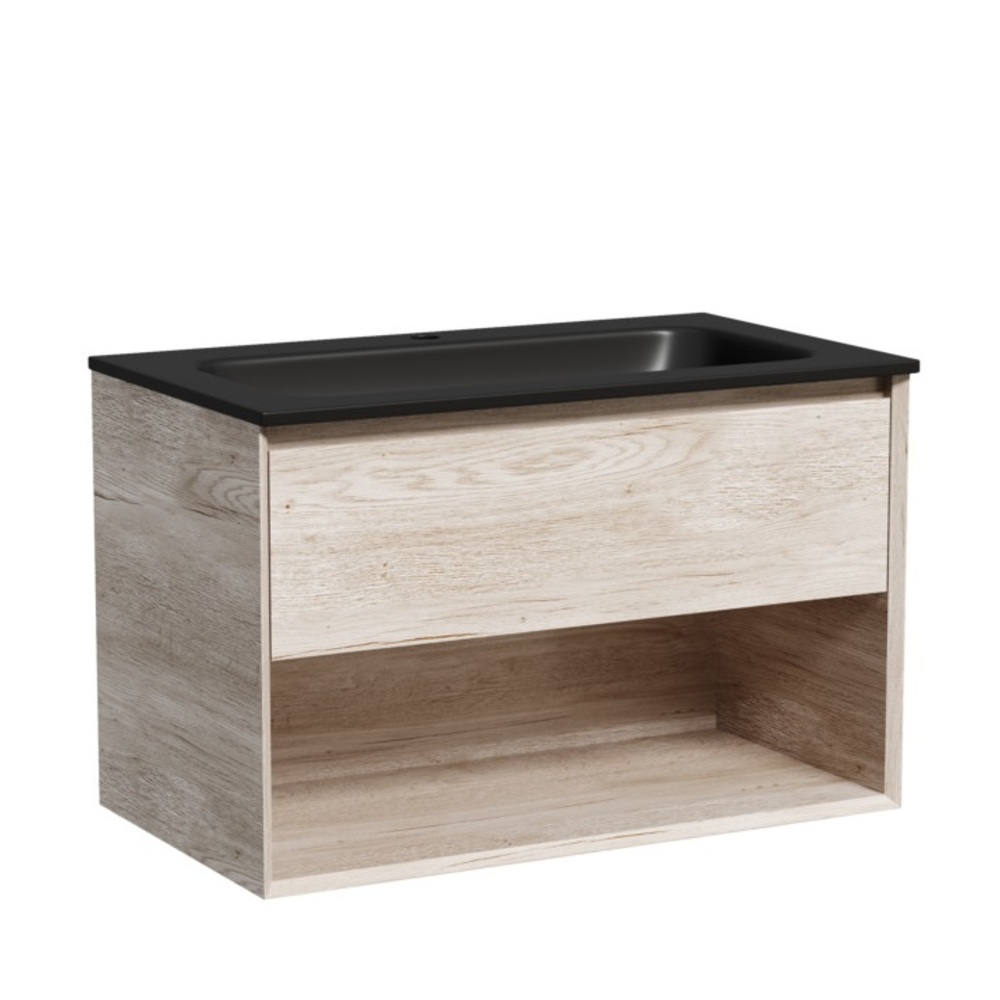 Тумба подвесная SANCOS Marmi 1.0 790х445х520 c одним ящиком оснащенным доводчиками скрытого монтажа с системой Soft close (плавного закрывания) и открытой нишей, c фрезерованной ручкой по всей длине фасада, дуб галифакс натуральный, арт. MR1.080EG