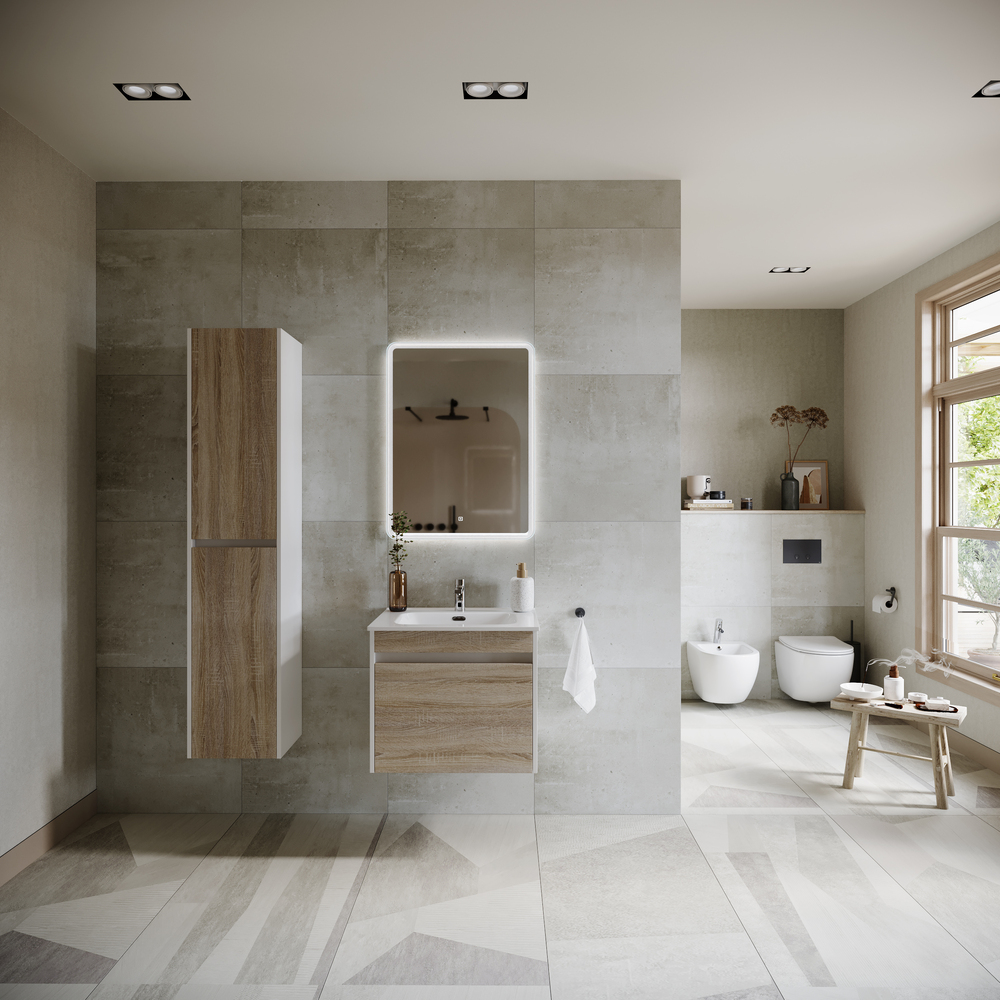 Тумба подвесная Smart c двумя ящиками оснащенными доводчиками скрытого монтажа с системой плавного закрывания, внешний и внутренний ящики. Каркас тумбы выполнен из МДФ, фасад – из ЛДСП в цвете «дуб бардолино/белый».