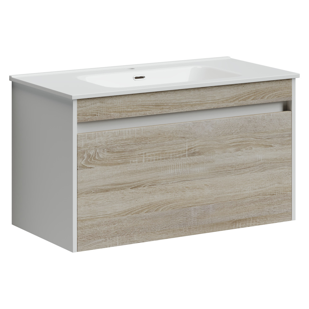 Тумба подвесная Smart c двумя ящиками оснащенными доводчиками скрытого монтажа с системой плавного закрывания, внешний и внутренний ящики. Каркас тумбы выполнен из МДФ, фасад – из ЛДСП в цвете «дуб бардолино/белый».