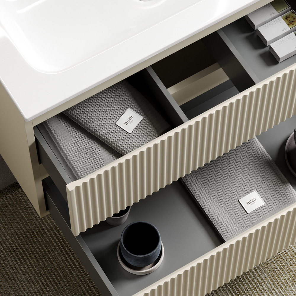 Тумба подвесная Snob R c двумя ящиками оснащенными доводчиками скрытого монтажа с системой плавного закрывания. Каркас и фасад тумбы выполнен из МДФ, покрытие ПВХ - пленка в цвете «Beige Soft».