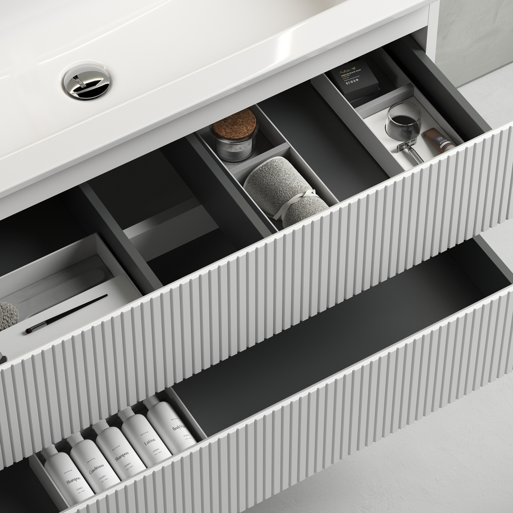 Тумба подвесная Snob T c двумя ящиками оснащенными доводчиками скрытого монтажа с системой плавного закрывания. Каркас и фасад тумбы выполнен из МДФ, покрытие пвх - плёнка в цвете «Bianco».