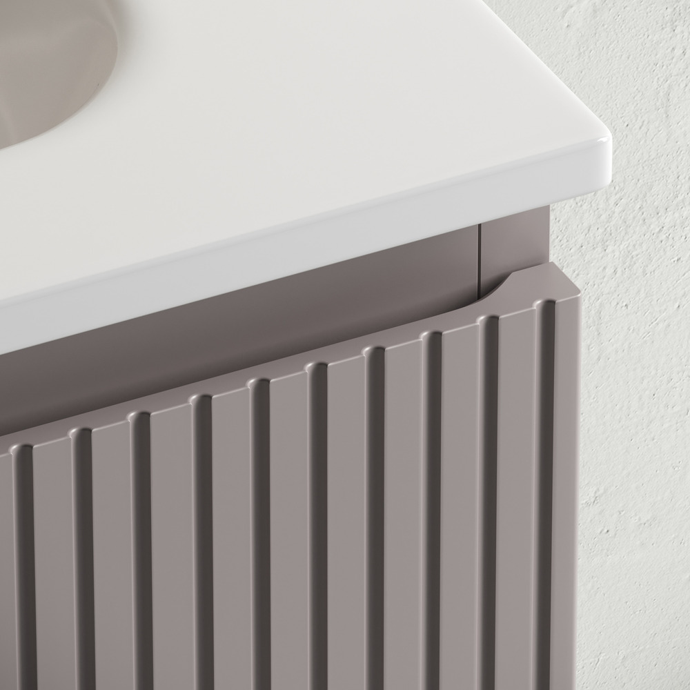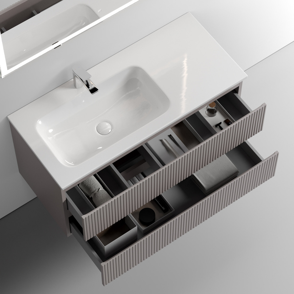 Тумба подвесная Snob T левая c двумя ящиками оснащенными доводчиками скрытого монтажа с системой плавного закрывания. Каркас и фасад тумбы выполнен из МДФ, покрытие пвх - плёнка в цвете «Doha Soft».