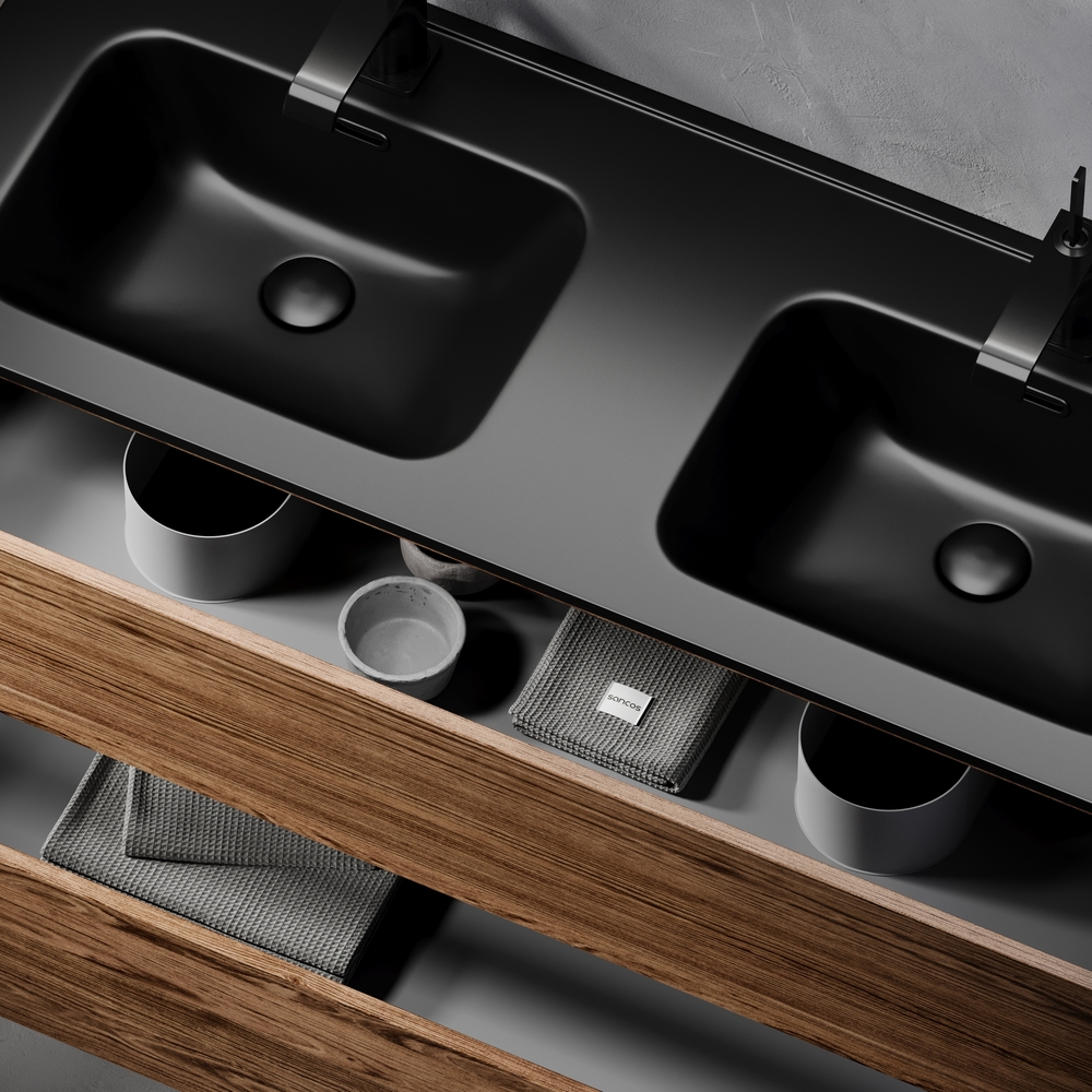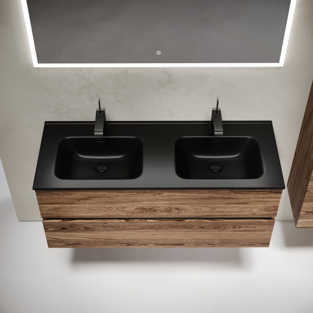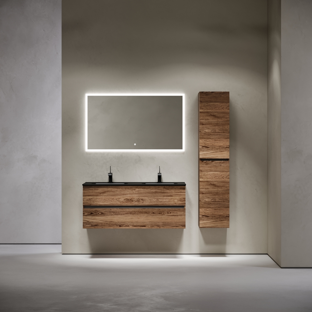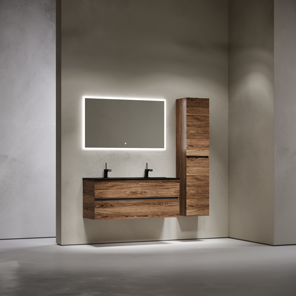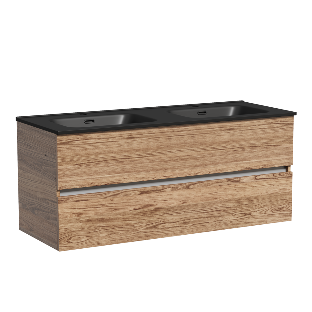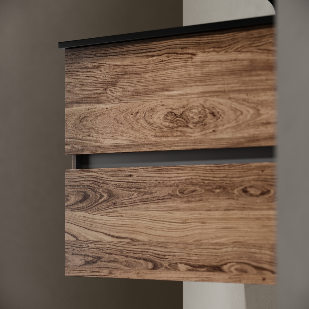 Тумба подвесная Urban c двумя ящиками оснащенными доводчиками скрытого монтажа с системой плавного закрывания, а также с ручкой Gola по всей длине тумбы. Каркас тумбы и фасад выполнен из ЛДСП в цвете «дуб чарльстон».