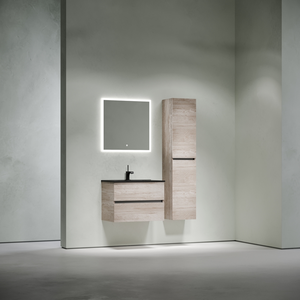 Тумба подвесная Urban c двумя ящиками оснащенными доводчиками скрытого монтажа с системой плавного закрывания, а также с ручкой Gola по всей длине тумбы. Каркас тумбы и фасад выполнен из ЛДСП в цвете «дуб галифакс натуральный».
