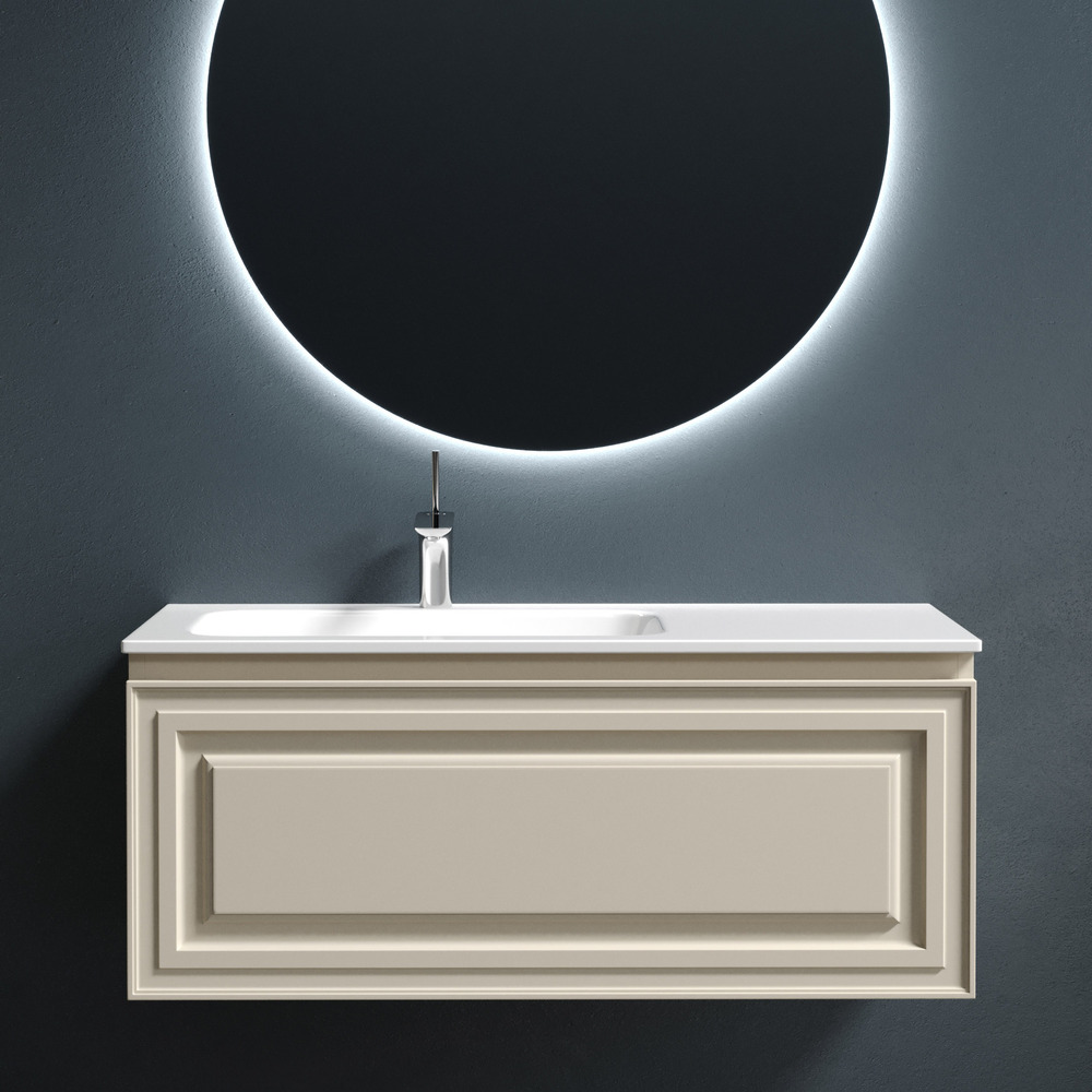 Тумба подвесная Very левая c одним ящиком, оснащенным доводчиками скрытого монтажа с системой плавного закрывания. Каркас и фасад тумбы выполнен из МДФ, покрытие пвх - плёнка в цвете «Beige Soft».