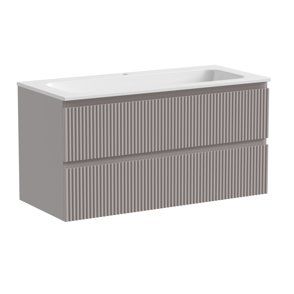 Тумба подвесная Snob R c двумя ящиками оснащенными доводчиками скрытого монтажа с системой плавного закрывания. Каркас и фасад тумбы выполнен из МДФ, покрытие ПВХ - пленка в цвете «Doha Soft».