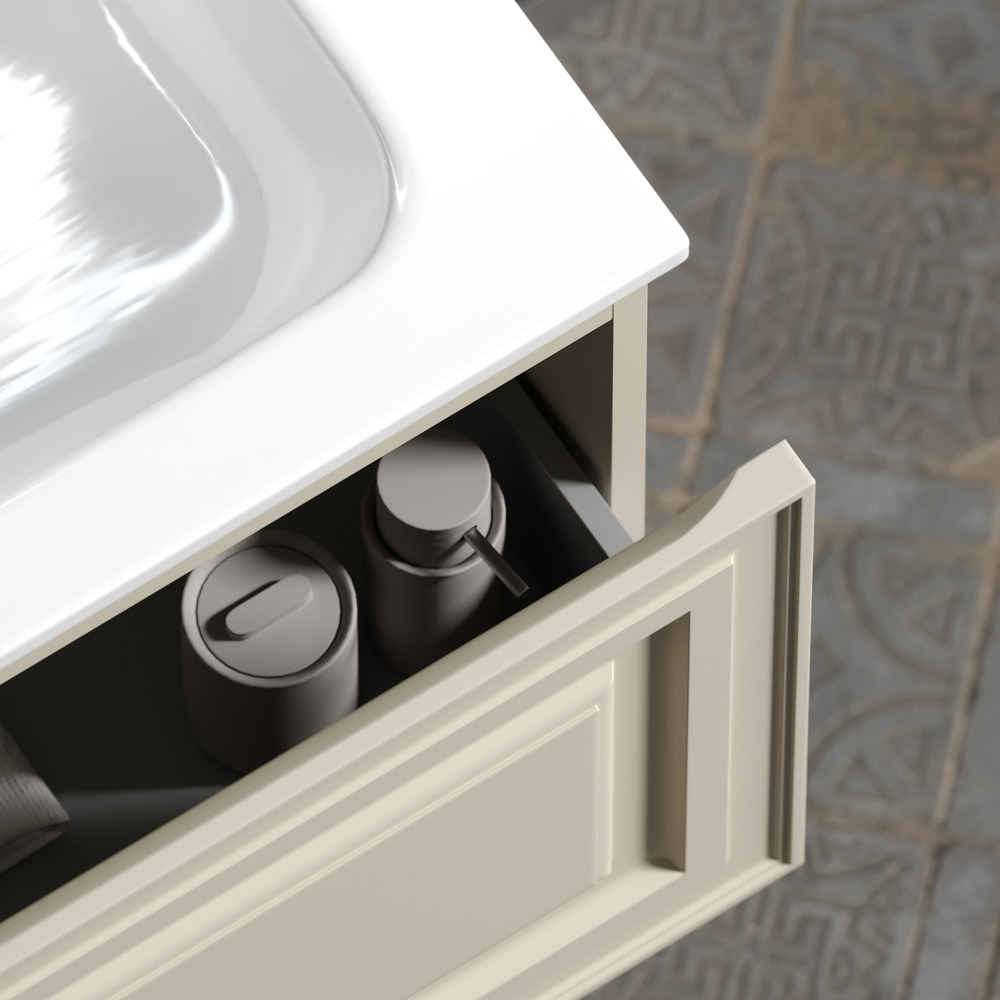 Тумба подвесная Very c одним ящиком, оснащенным доводчиками скрытого монтажа с системой плавного закрывания. Каркас и фасад тумбы выполнен из МДФ, покрытие пвх - плёнка в цвете «Beige Soft».