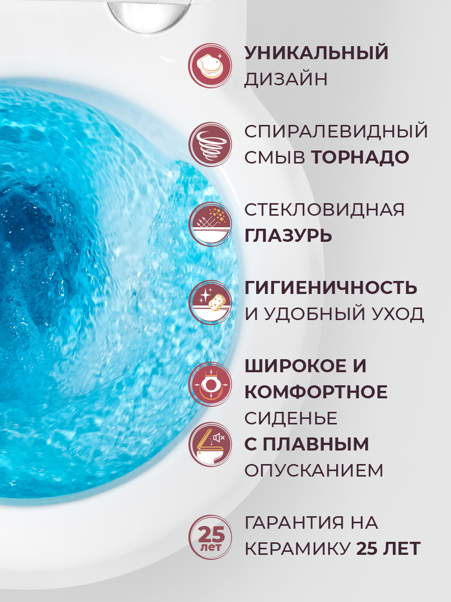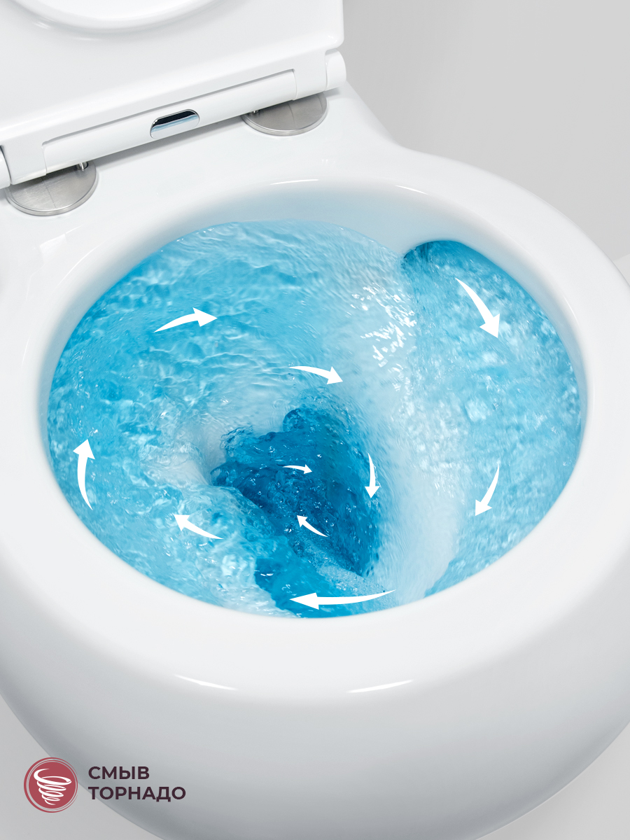 Используется самая эффективная система смыва TORNADO: струя воды из отверстия в чаше создает эффект водоворота, что позволяет полностью очищать всю внутреннюю поверхность унитаза. Работает почти бесшумно, эффективный смыв осуществляется даже небольшим количеством воды, что позволяет настроить объем смыва на минимальные значения. Система смыва и конструкция чаши полностью исключает выплескивание воды