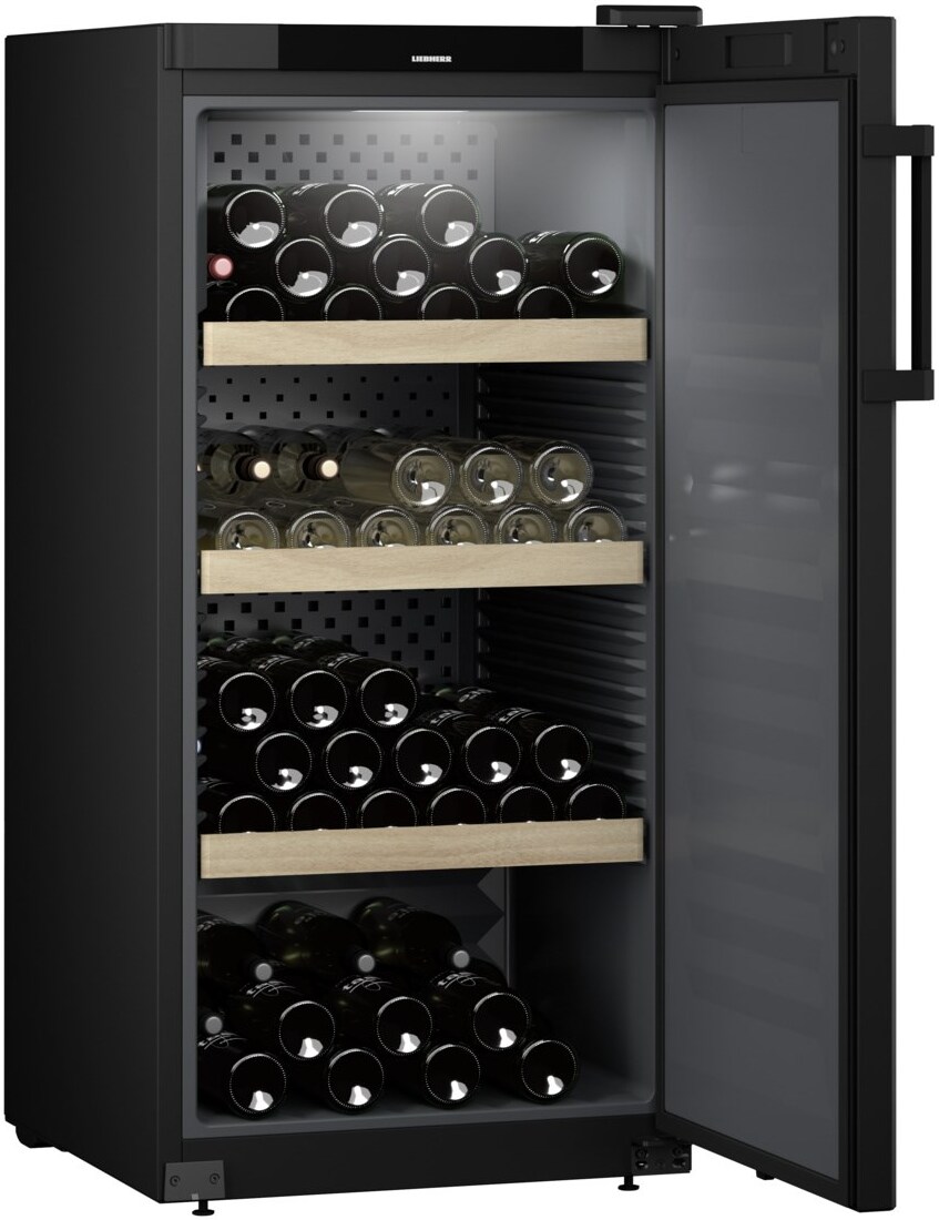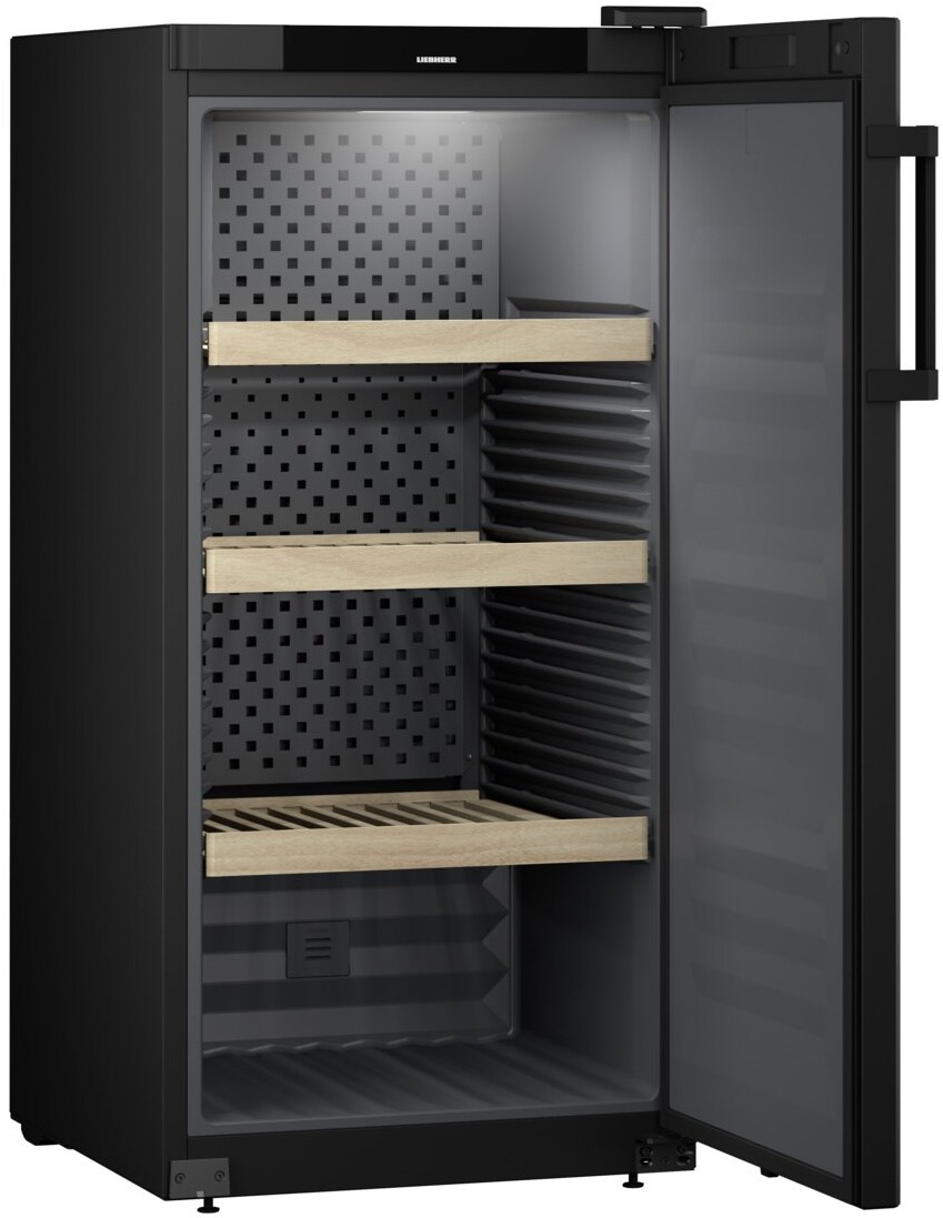 Винный шкаф Liebherr WSbl 4201 — изысканная модель, которая станет превосходным дополнением к вашей кухне или гостиной. Корпус и непрозрачная дверь выполнены из нержавеющей стали. Этот материал отличается долговечностью и надежностью. Эргономичная ручка, расположенная справа, позволяет без труда пользоваться устройством. В качестве основного цвета выбран глубокий черный оттенок с матовым покрытием. Элегантный и эстетичный дизайн подойдет к любому интерьеру. Полки изготовлены из натурального дерева. Управление осуществляется через электронный дисплей в верхней части дверцы. С его помощью можно точно настроить температуру в диапазоне от 5 до 20 градусов.