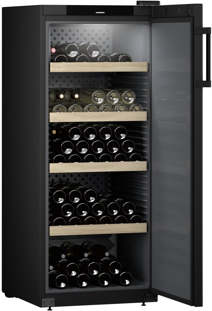 Винный шкаф Liebherr WSbl 4601 — элегантная модель, которая сочетает в себе стильный внешний вид и высокую функциональность. Дизайн выполнен в эстетике минимализма с использованием прямых плавных линий и и гладких поверхностей. В качестве основного оттенка выбран матовый черный. Покрытие корпуса сделано из надежной нержавеющей стали, а полки изготовлены из натурального дерева. Классическое сочетание древесной текстуры и черного цвета делает внешний вид устройства эстетичным и изящным. Панель управления находится в верхней части дверцы и представляет из себя дисплей и кнопки для точной настройки температуры.