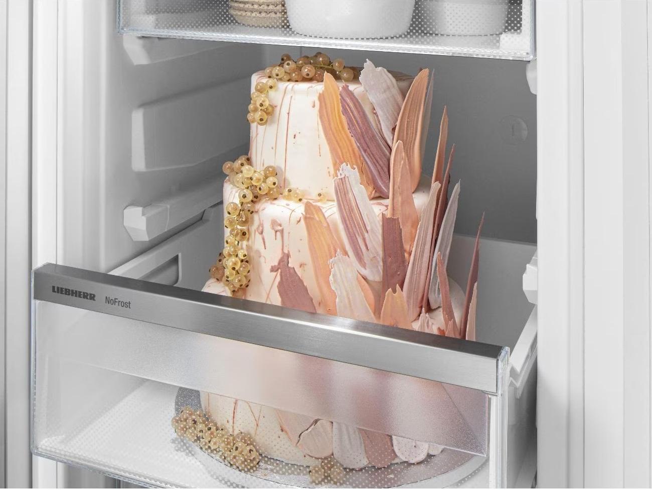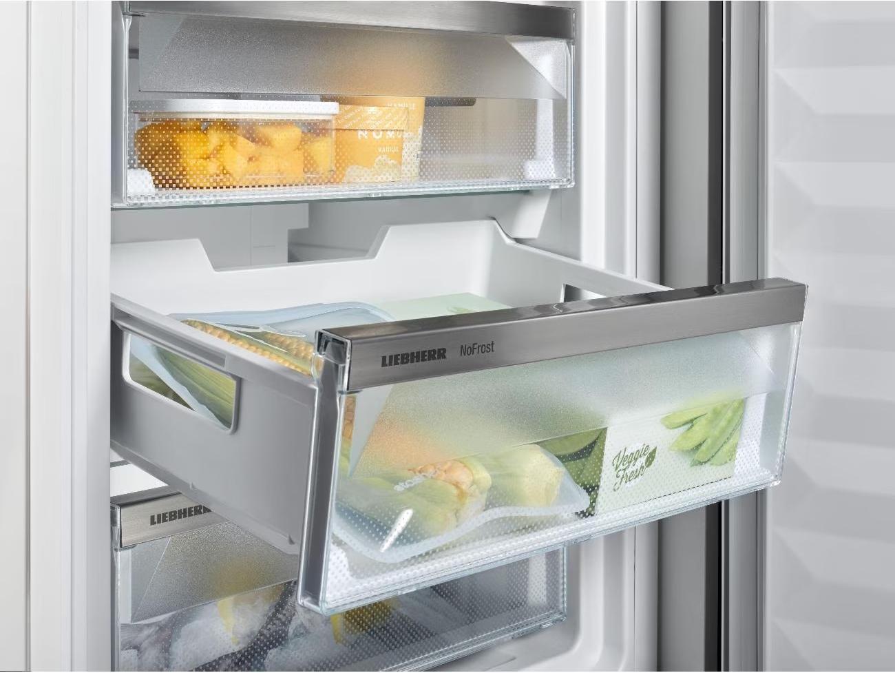 Мощность замораживания достигает 11 кг в сутки. Система FrostSafe с закрытыми со всех сторон прозрачными выдвижными ящиками обеспечивает удобство хранения продуктов, а система VarioSpace позволяет регулировать пространство внутри камеры в соответствии с потребностями пользователя. Двери устройства перевешиваемые, что позволяет установить их в соответствии с особенностями кухни.