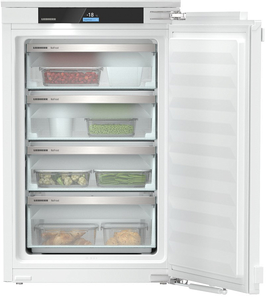 Встраиваемая морозильная камера Liebherr IFNd 3954 — это вместительная и функциональная модель. Она предполагает встраивание в гарнитур и имеет специальные крепления для фасада, что позволяет гармонично интегрировать ее в любой интерьер. Панель управления расположена в верхней части устройства в виде сенсорного дисплея Touch&Swipe. Понятный и интуитивный интерфейс дает возможность без проблем настраивать температуру и активировать нужные функции. Благодаря доводчику SoftSystem дверца закрывается плавно и бесшумно, что предотвращает возможные повреждения.