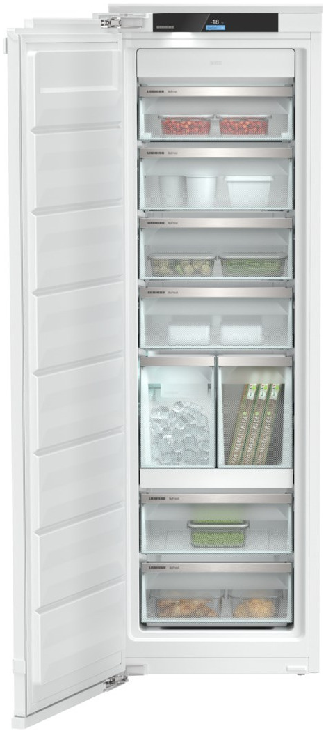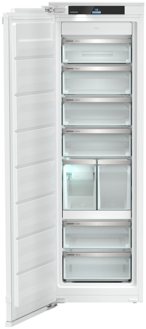 Встраиваемая морозильная камера Liebherr SIFNAe 5188 — воплощение немецкой инженерной мысли и современного премиального дизайна. Высокий корпус из стали с лаконичными линиями и точными пропорциями (177 x 55.9 x 54.6 см) гармонично интегрируется в кухонный гарнитур благодаря системе жесткого крепления Door-on-door и регулируемым ножкам. Стальная дверь дополнена доводчиком SoftSystem, который обеспечивает плавное и бесшумное закрытие, а угол открытия 115° облегчает доступ к содержимому. Светодиодное внутреннее освещение и отдельная подсветка IceMaker-Safe создают комфорт при эксплуатации даже в условиях минимального освещения, а сенсорная панель управления Touch&swipe скрыта за дверью, сохраняя чистоту линий фасада. Устройство оснащено сменным уплотнителем, что продлевает срок службы и поддерживает безупречный внешний вид на долгие годы.