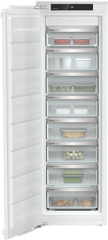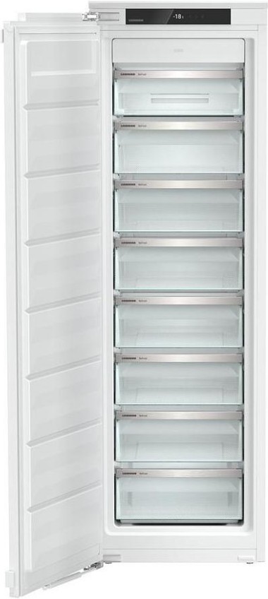 Внутри встраиваемой морозильной камеры Либхер SIFNf 5128 Plus NoFrost вы найдете 8 вместительных ящиков из прочного стекла по технологии FrostSafe. Она помогает сохранять герметичность и предотвращать проникновение тепла и нарушение температурного режима. В комплектацию также входит поднос для замораживания и специальный лоток для льда. Встроенные направляющие облегчают доступ к продуктам. Модель имеет несколько автоматических программ, например, режим SabbathMode, который выключает все световые индикаторы и снижает уровень шума на определенное время, функцию BottleTimer для подготовки напитков к подаче и PartyMode для быстрой заморозки больших партий продуктов.