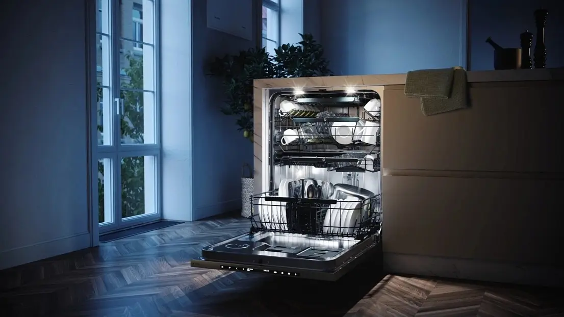Встраиваемая посудомоечная машина DFI544B имеет 7 зон подачи воды для обеспечения качественных результатов мытья и телескопические направляющие для плавного скольжения корзин.