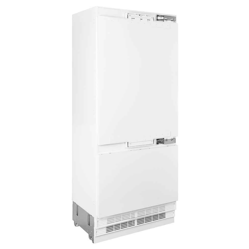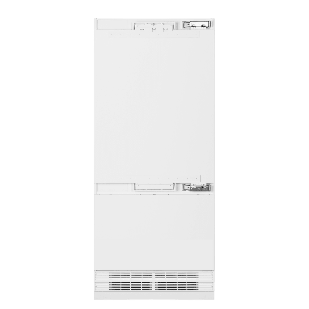 Высокий встраиваемый двухкамерный холодильник TOTAL NO FROST с шириной 91 см, с инверторным компрессором и многопоточным охлаждением Metal Air Flow, сенсорным управлением каждой зоны, зоной свежести Fresh Zone на 69 л, верхней и боковой LED подсветкой и серебристой отделкой полок