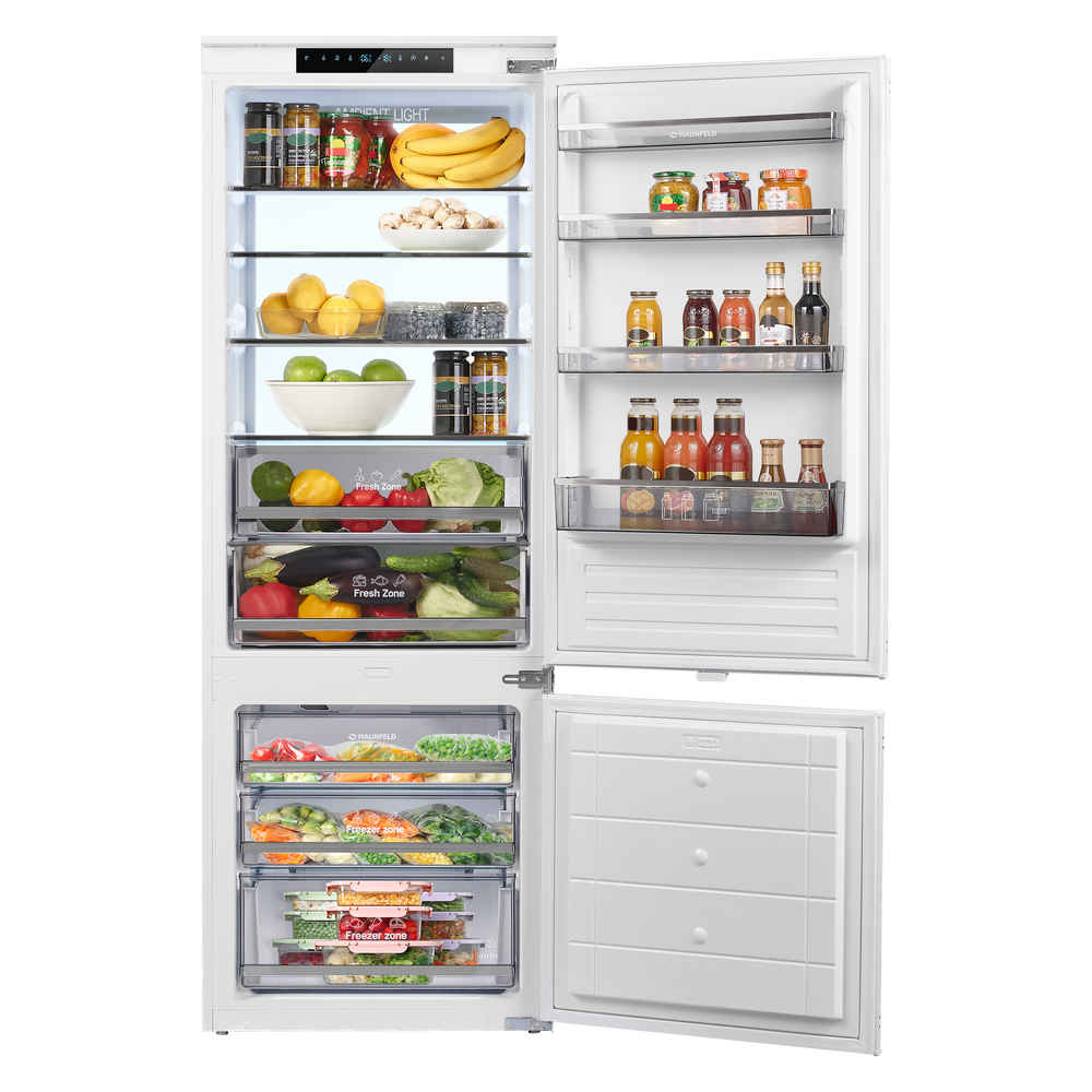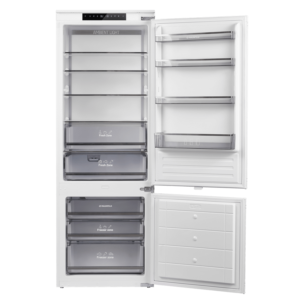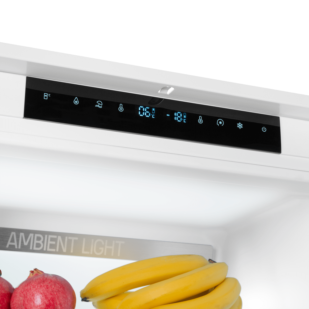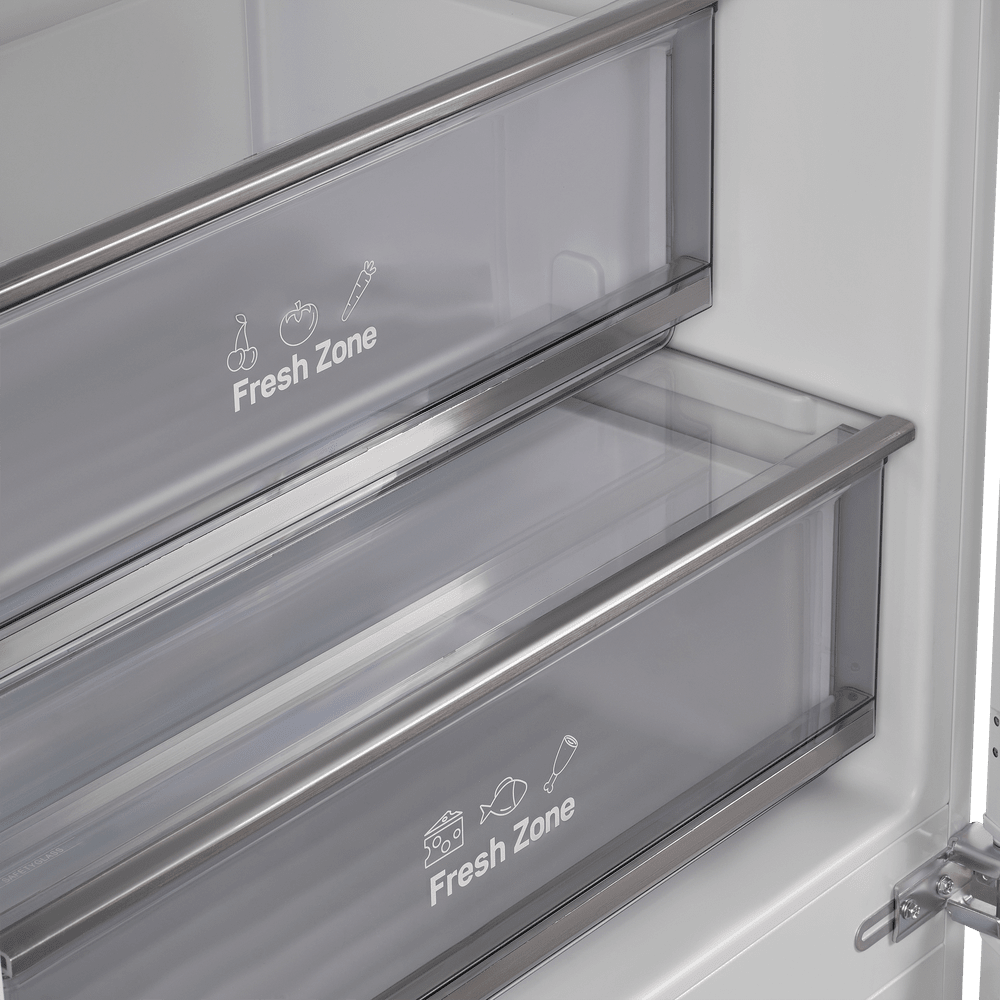 Встраиваемый двухкамерный холодильник шириной 69 см и высотой 193 см TOTAL NO FROST с инверторным компрессором и многопоточным охлаждением, с большой светящейся LED панелью на задней стенке и широкой сенсорной панелью управления, зоной свежести Fresh Zone и тонированными выкатными ящиками с металлизированной отделкой