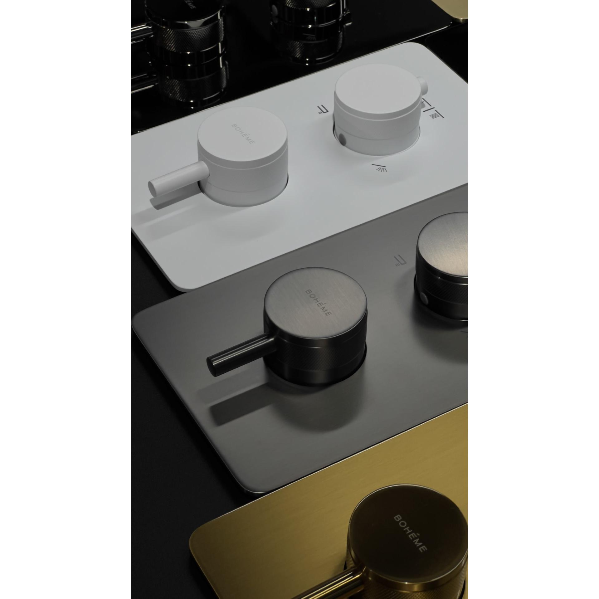 Встраиваемый смеситель для душа с термостатом Boheme CELL THERMO. Бокс для комфортного монтажа в стену. Термостат от мирового лидера, французского производителя Vernet. Версия на 2 выхода(верхний душ и ручная лейка). Идеально дополняется душевым набором Boheme CELL арт.427 с 2-х режимной верхней лейкой. 8 цветов в наличии.