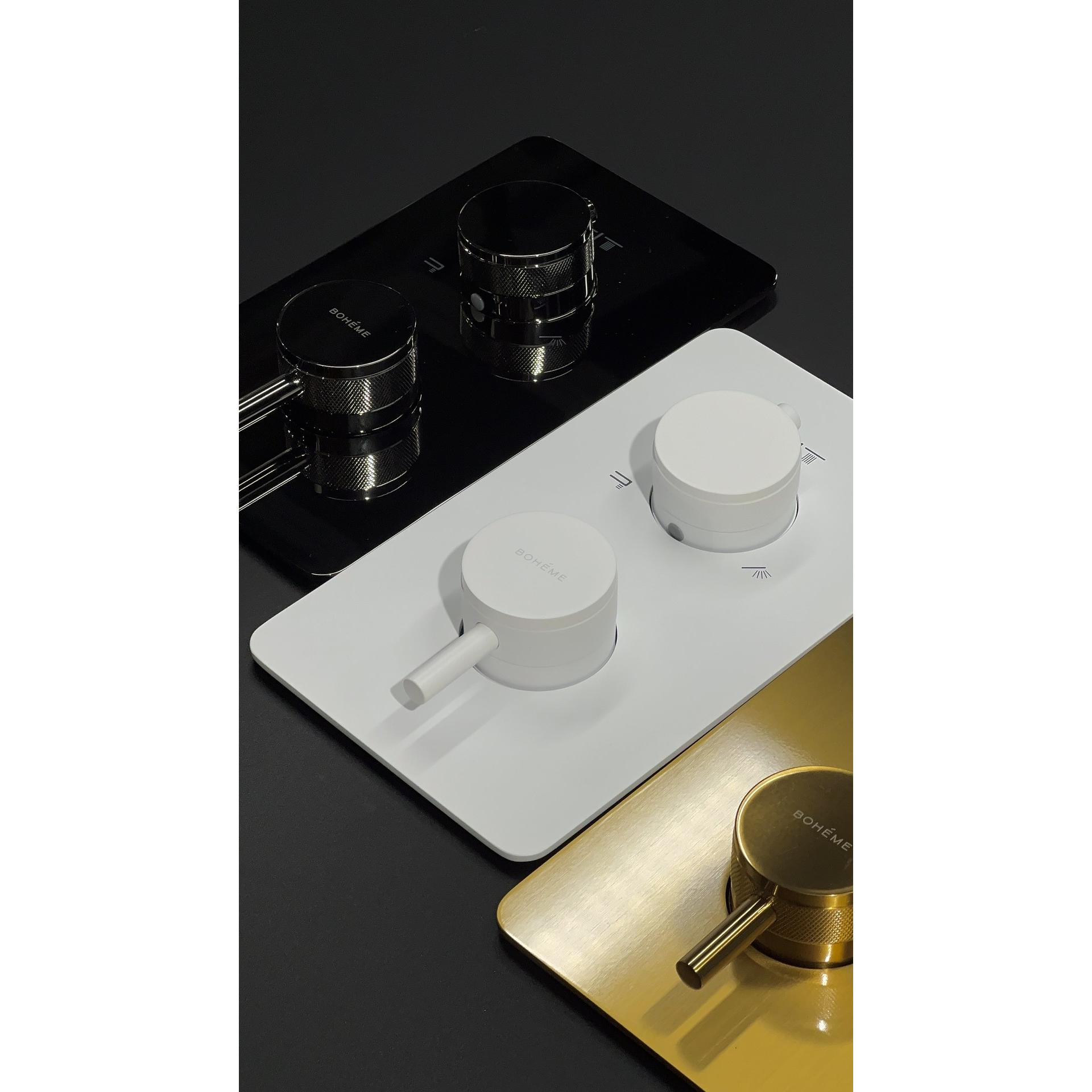 Встраиваемый смеситель для душа с термостатом Boheme CELL THERMO. Бокс для комфортного монтажа в стену. Термостат от мирового лидера, французского производителя Vernet. Версия на 2 выхода(верхний душ и ручная лейка). Идеально дополняется душевым набором Boheme CELL арт.427 с 2-х режимной верхней лейкой. 8 цветов в наличии.