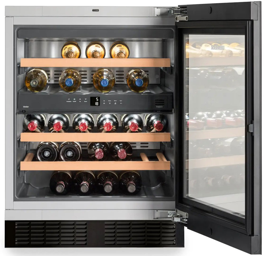 Встраиваемый винный шкаф Liebherr UWTgb 1682 создаст оптимальные условия для хранения алкогольных напитков. Он не занимает много места и отлично сочетается со всеми видами кухонных гарнитуров. Устройство прекрасно выглядит и станет настоящим украшением интерьера. Управление электронное. На сенсорном дисплее отображается температура в винном отсеке. Панель можно заблокировать от детей. Малыши не смогут изменить настройки. Если вы неплотно закроете дверцу, звуковой сигнал напомнит вам об этом. Дверца выполнена из тонированного стеклопакета. Она надежно защищает содержимое от воздействия ультрафиолета.