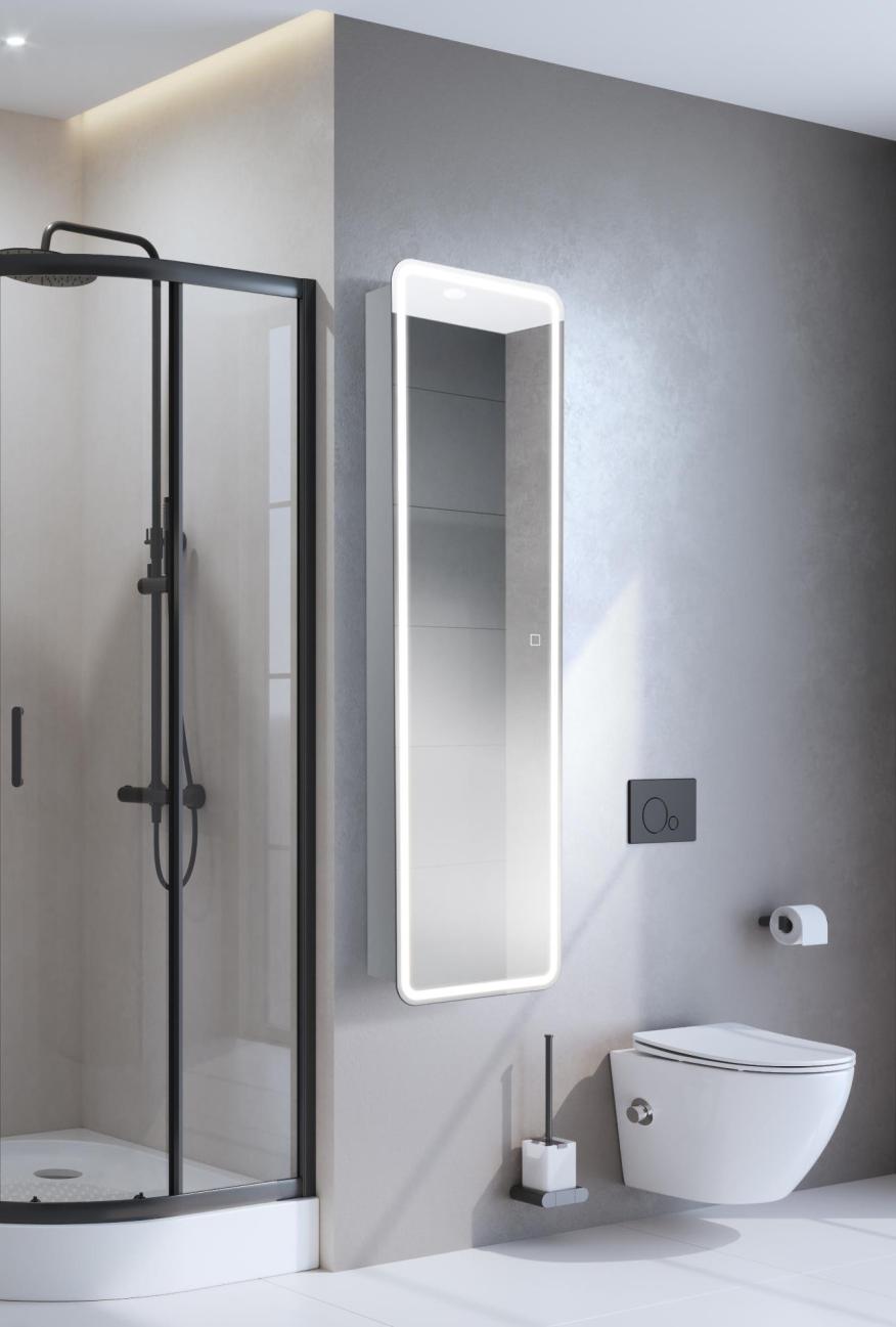 Зеркальный шкаф с одной распашной дверью, двумя стеклянными полками, со встроенной LED подсветкой и сенсорным выключателем
